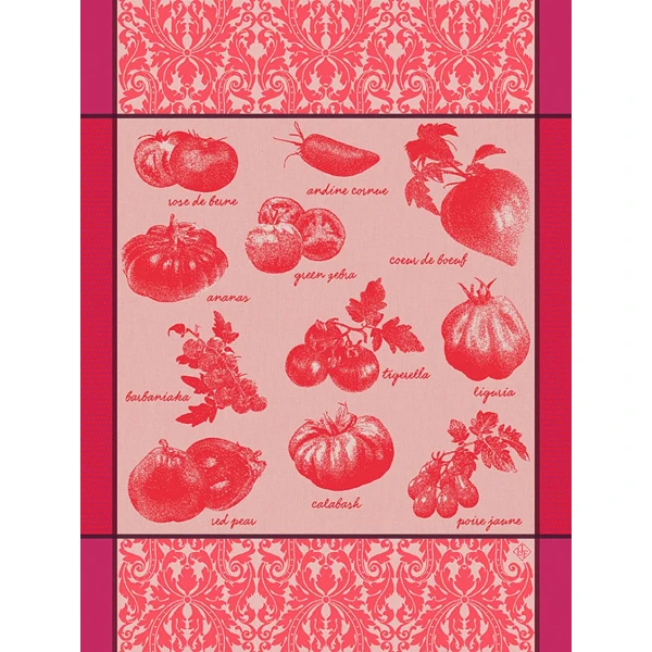 Le Jacquard Francais' Tomates tea towel will invoke in you the desire to create a variety of summer recipes with tomatoes as the main ingredient!  A gourmet collection highlighting the immense varieties of tomatoes.  The tea towel has a woven label to hang it easily in your kitchen.  Available in three colors. 100% long staple combed cotton.  France.