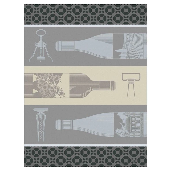 Le Jacquard Francais Vin en Bouteille tea towel is fantastic. The design is three different bottles of wine with a picturesque scene on each bottle and three different bottle openers.  Comes in White, Rose and Red. 100% cotton. Size: 24 x 31".  From France.