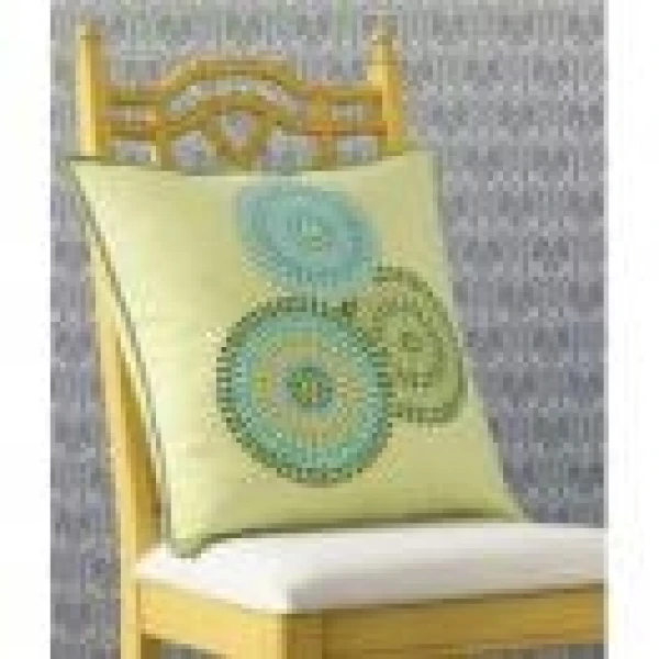 From Sferra's 1891 collection, the Lexington pillow is pale yellow linen in the background, with embroidered circles in shades of blue and green. Piped all around in a green linen. Ships with insert -- on in stock -retired.
