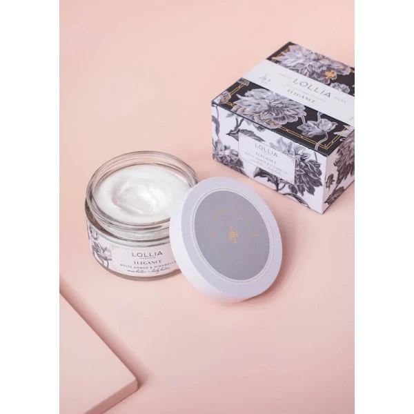 Lollia’s Elegance Body Butter is ultra-nourishing and richly comforting. Aloe and Shea Butter envelop your body in lush hydration as Cocoa Butter and Avocado Oil restore radiance. Delicate floral infusions of White Amber & Mirabelle leave skin delightfully scented.