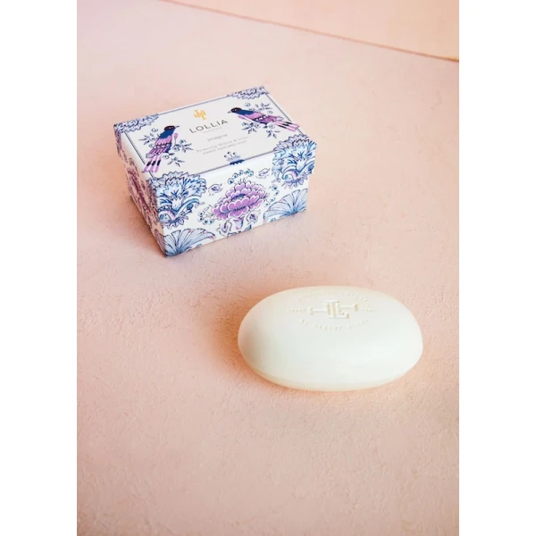Lollia's Imagine Boxed Shea Butter Soap's fragrance is Flowering Willow & Lotus. Made from only the finest ingredients, our signature triple-milled formula combines nourishing Olive Fruit & Coconut Oils with rich Shea Butter to smooth & soften skin. Our exclusive fragrance blend, inspired by the nostalgic romance of hand-made soap, honors the art of fine soap-making with delicate infusions of Flowering Willow & Lotus in a breeze of Rice Flower and Coconut Milk kissed by dew drop notes of Mandarin and Jasmine petals. Housed in an elegant keepsake box, striking songbirds perched amid a dreamy chinoiserie-inspired garden scape are set off by a delightful pop of color inside.
