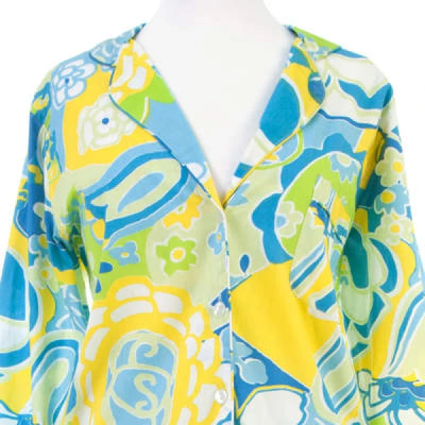 A menswear favorite reinterpreted in 100% cotton and a fanciful print. Long-sleeve top has collar, front button closure, breast pocket, and side vents. Pants have elastic waist with drawstring.