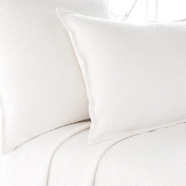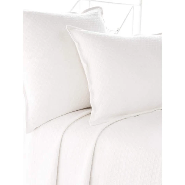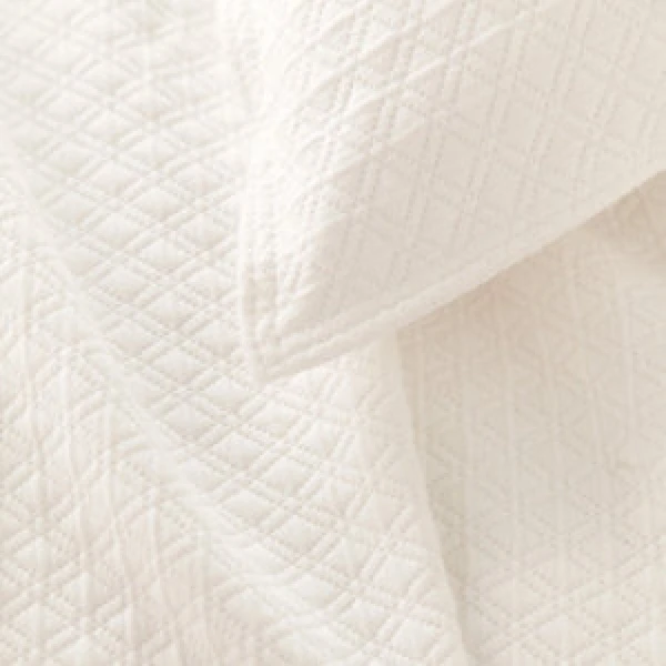 100% prewashed lightweight cotton. These easy to wash Coverlet & sham have straight edges. In White, Sand & Ivory along with other great color options.  Small diamond pattern throughout.
