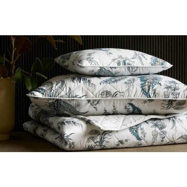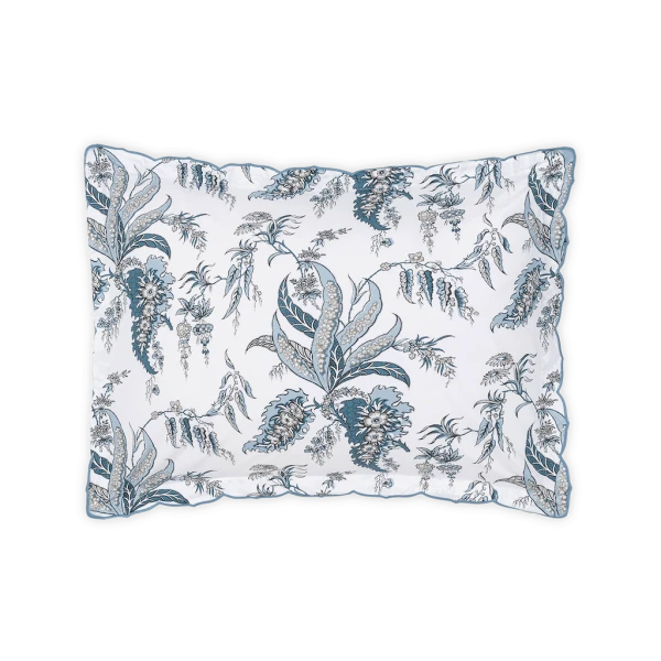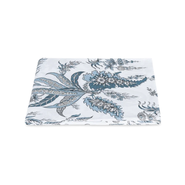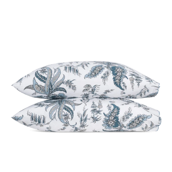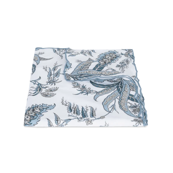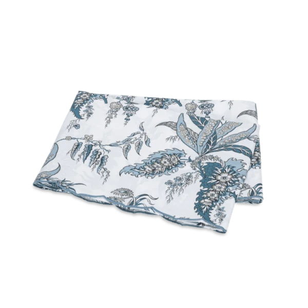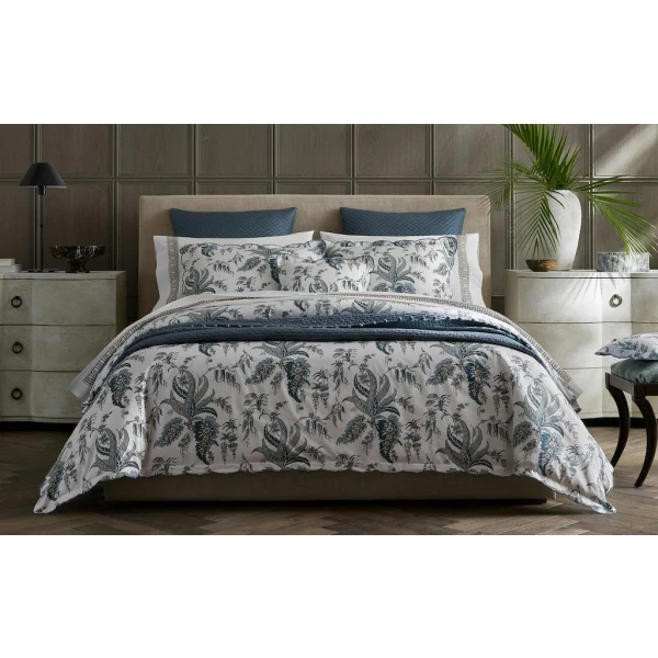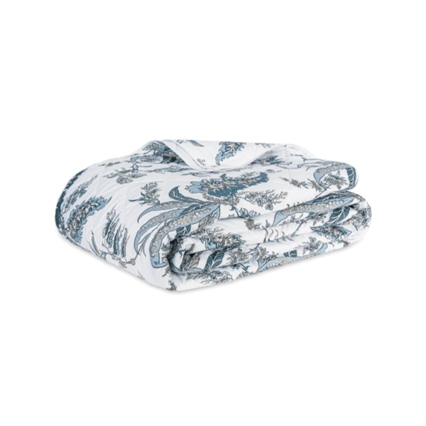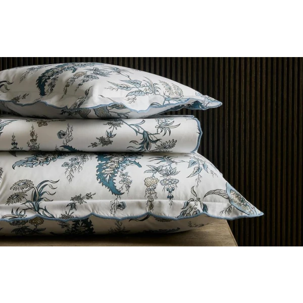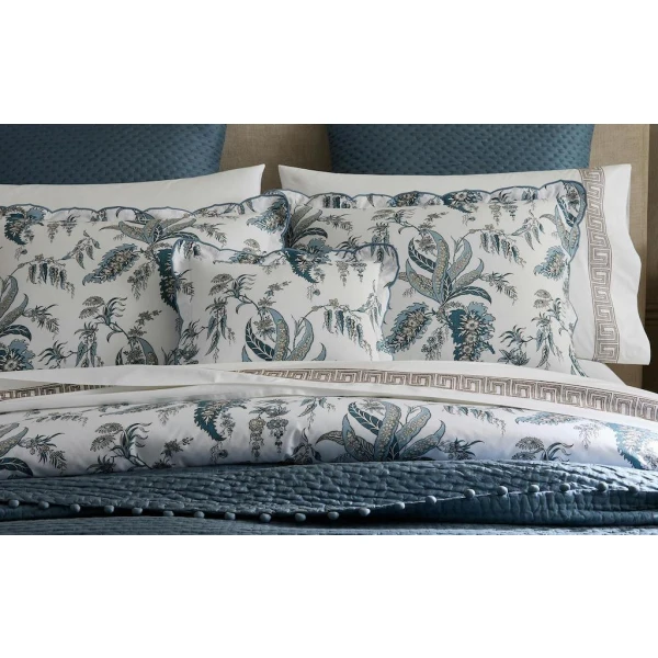 Matouk's Apolline is a beautiful marriage between grace and classic sophistication. The design is a Schumacher botanical print that embodies the British Countryside. Duvet cover has Luca white 500 tc sheeting on the reverse. Quilts have Amalfi Mediterranean sheeting on the reverse. The quilting is a 4" diamond pattern and filled with 100% polyester batting, 100 gm per square meter. 100% Egyptian cotton. Made in the USA of fabric from Italy.
