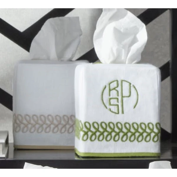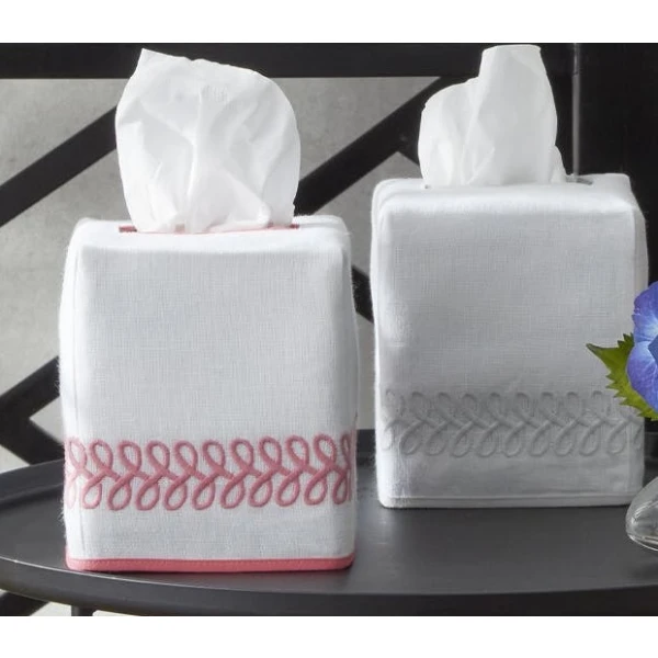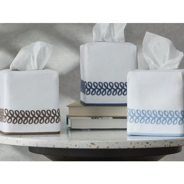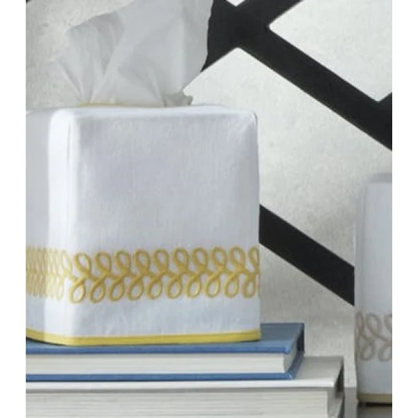 Matouk's Astor Braid Tissue Box Cover is a 100% linen cover.  The cover is adorned with the astor braid to complement the bedding of the same name.  Finished with a matching color taped edge.  Available in several colors.