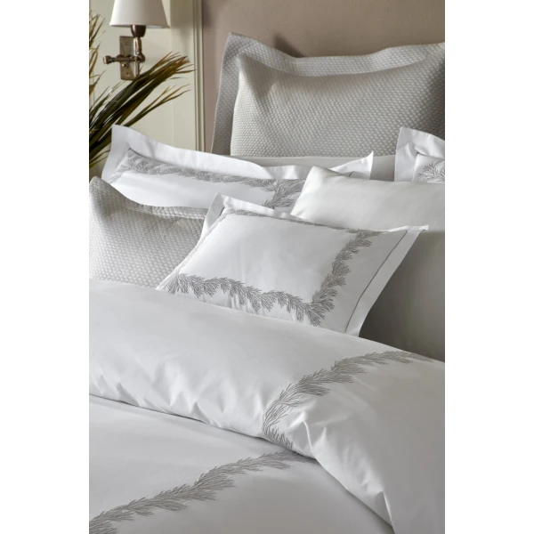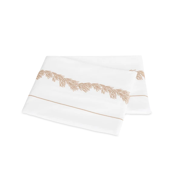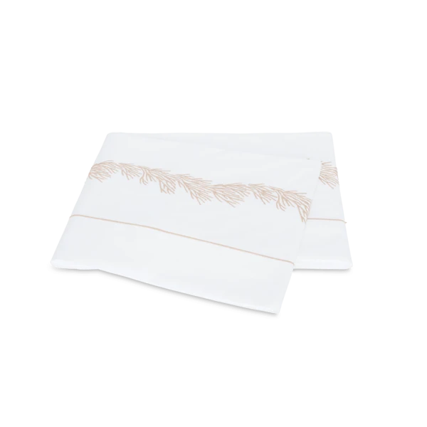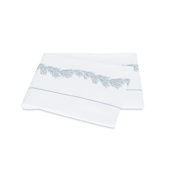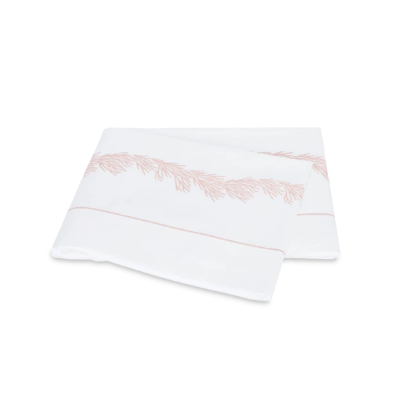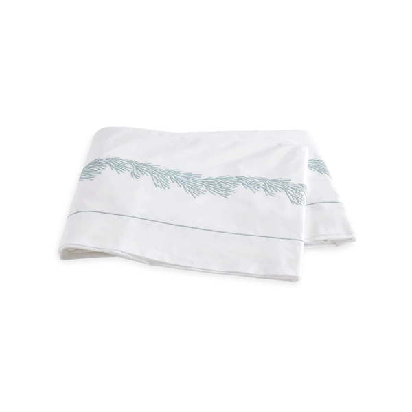 Matouk's Atoll is a feathery coral embroidery elegantly borders Ceylon sheeting 520 thread count cotton percale woven in India.  Duvet Covers have embroidery in a U-shape on top of bed.  Atoll Fitted Sheets are "Ceylon" sheeting. 100% cotton.