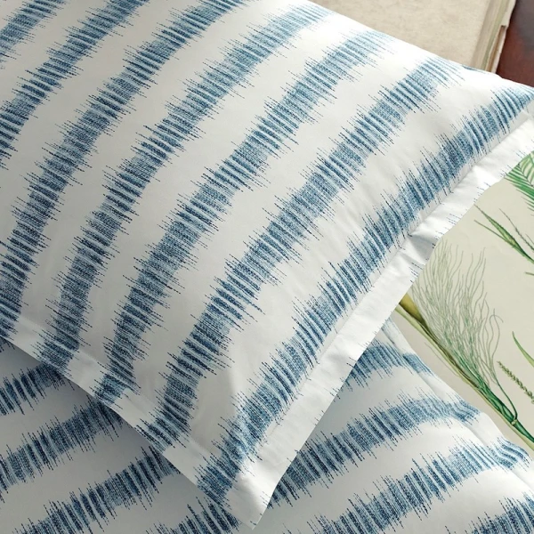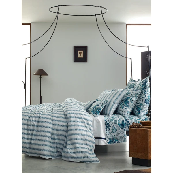 Matouk's Attleboro Collection is light, fresh, and colorful.  It has a sweet look of Ikat Style print in colorful yet soft stripes. This design came from the archive of Schumacher's designs. Schumacher is well know for traditional American classics in fabrics and wall papers. This collection comes in 4 delightful colors and can be mixed and match with other collections.  We especially love it with Pomegranate as seen in this picture.