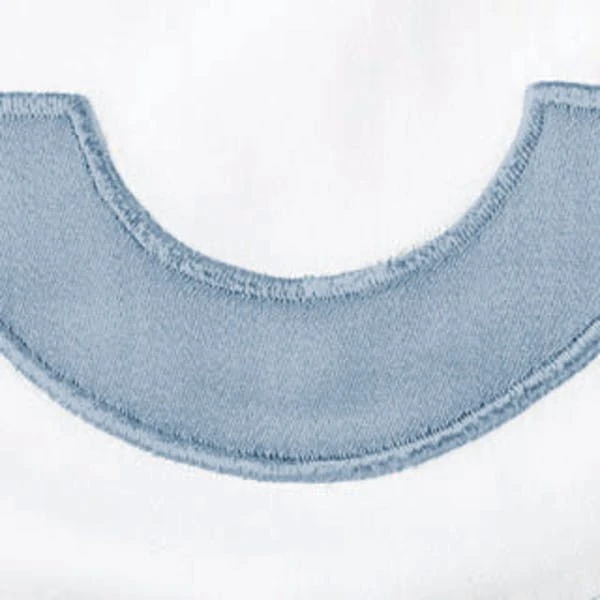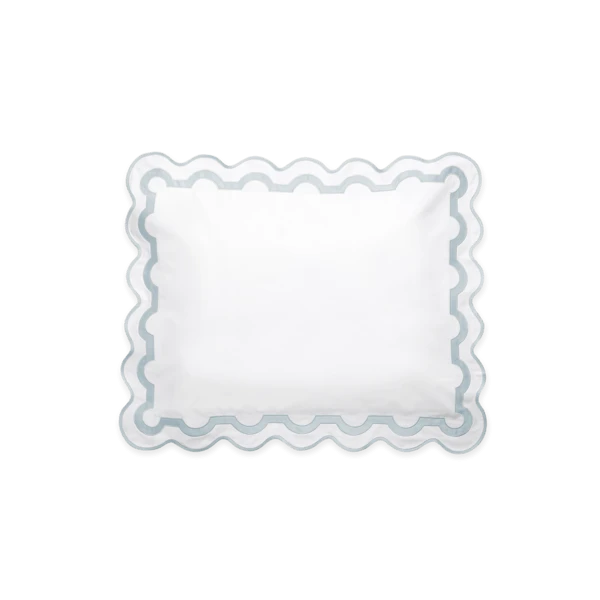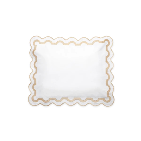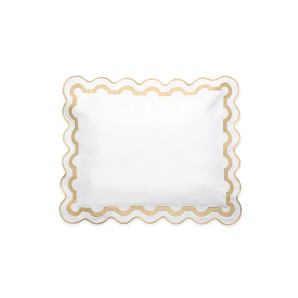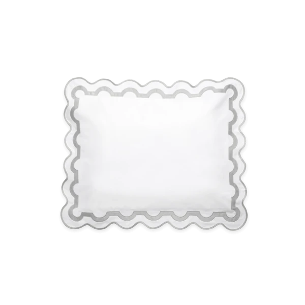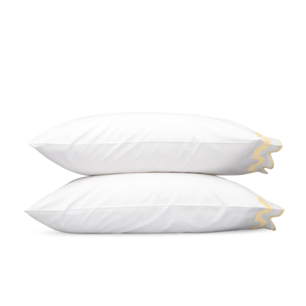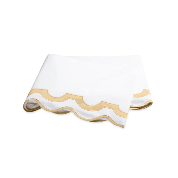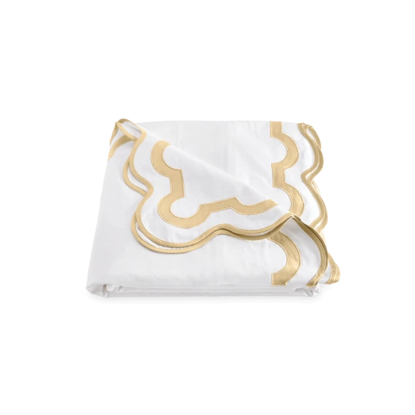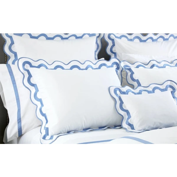 Matouk's Mirasol is elegant and tasteful.  It is white percale with contrasting applique arch border in Nocturne sateen.  Duvet covers have 1" sateen applique tape on the top of the bed in a U-shape and applique arch border on the three 3" flanges. Mirasol fitted sheets are labeled "Milano".  600 thread count Egyptian cotton woven in Italy.