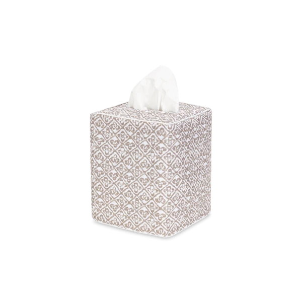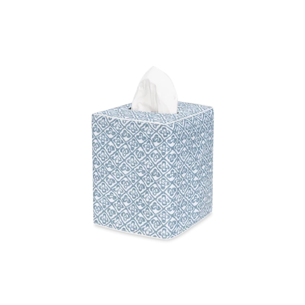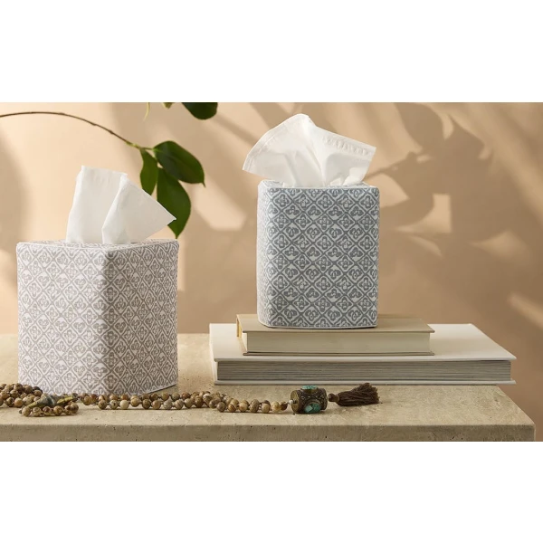Matouk's Catarina Tissue Box Cover has a small-scale, delicately faded quatrefoil motif. Schumacher's fabric archive comes to life across the smooth Luca percale, introducing a rich textural geometry. Available in a choice of vintage-inspired colors. Luca 500 thread count Egyptian cotton percale. The perfect finishing touch for bedrooms and bathrooms. 100% Egyptian cotton outer shell with 100% linen lining. Made in the Philippines of fabric from Italy.