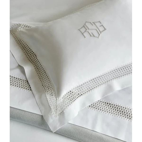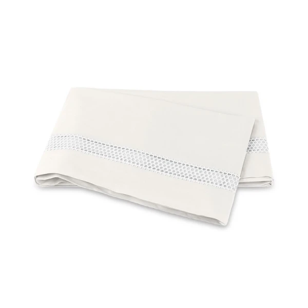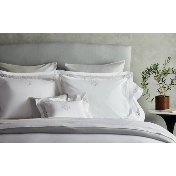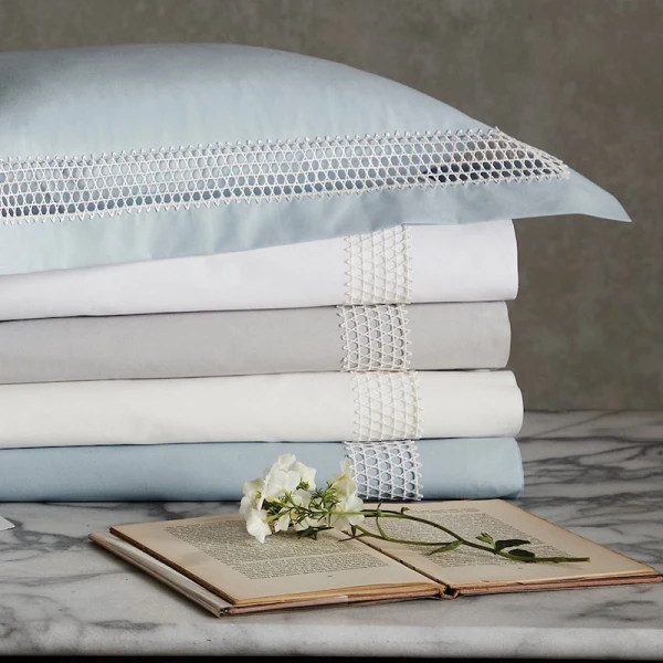 Matouk's Olivia heritage lace adds its exquisite beauty to their soft, lightweight Bergamo Giza Egyptian 500 thread cotton percale.  The duvet covers and shams have a 2.75" flange.  This is the perfect marriage between heritage and style.   Cecily Fitted Sheets are "Bergamo" sheeting.