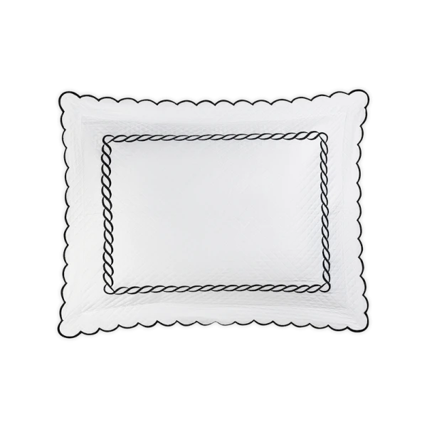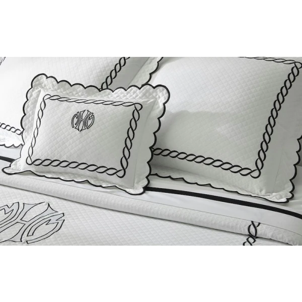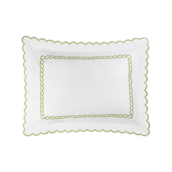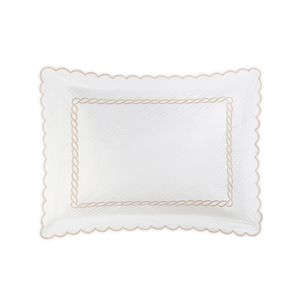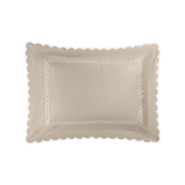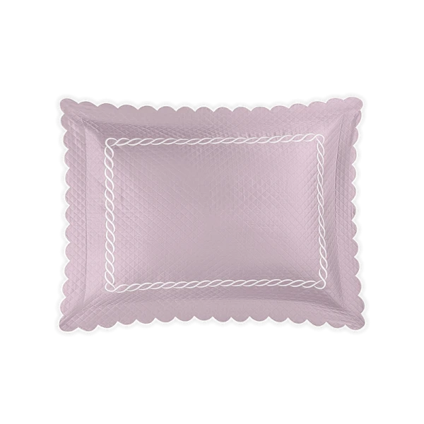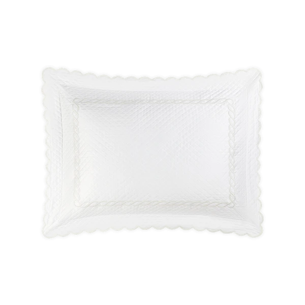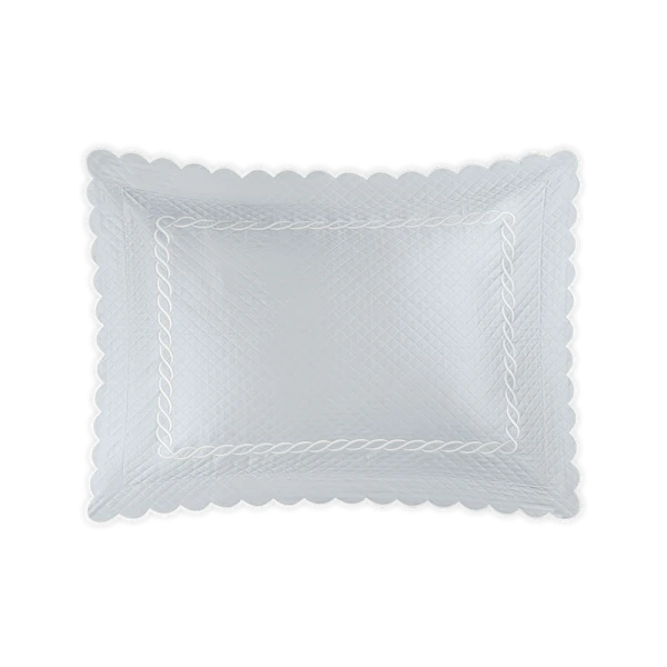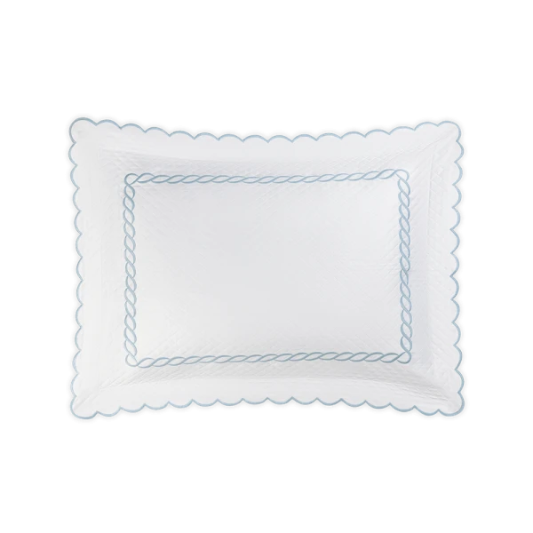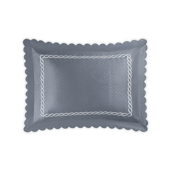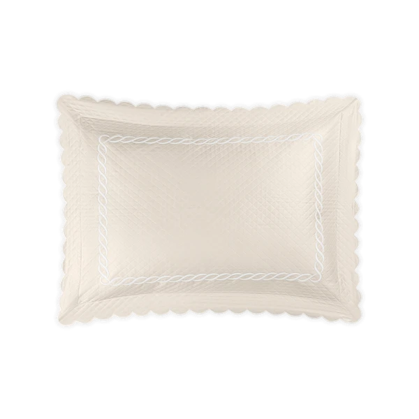 Matouk's Classic Chain Scallop Matelasse will elevate your bedroom with this expertly crafted Matouk collection, where the Petra diamond matelasse foundation meets the distinctive Classic Chain embroidery in a harmonious design. The intricate embroidered detailing showcases refined artistry across multiple hues, while the delicate scalloped border provides an elegant finishing accent. Each sham includes a generous 2.5-inch flange for added dimension, with the exception of the neck roll. Constructed from premium 100% cotton woven in Portugal and finished in the USA, this collection represents the pinnacle of quality bedding craftsmanship.