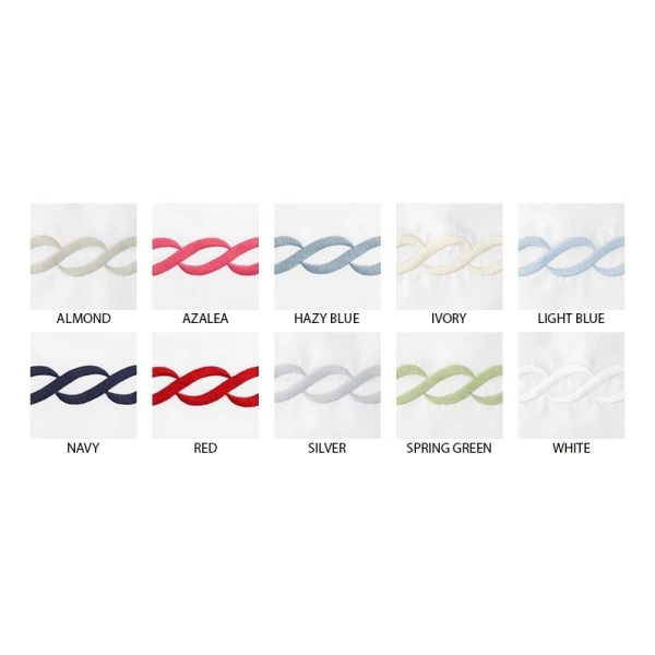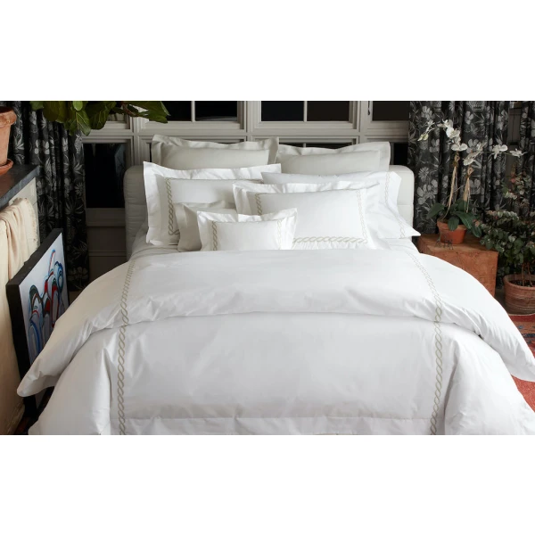 Matouk's Classic Chain Collection is simple and classic.  The chain is reminiscent of a simple Greek design. The chain itself flows elegantly on a chic white percale. Embroidered on Matouk's white Sierra 350 TC 100% cotton percale.