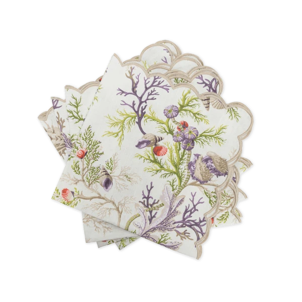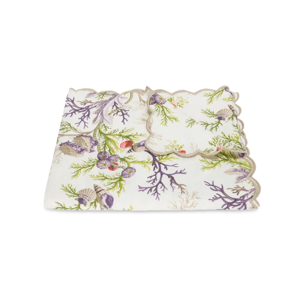 Matouk's Del Tesoro table collection has a Schumacher toile design that is colorful and whimsical. The underwater elegance of Del Tesoro with the maritime creatures is enchanting and beautiful. 100% printed linen. Made in the USA of fabric from Portugal.