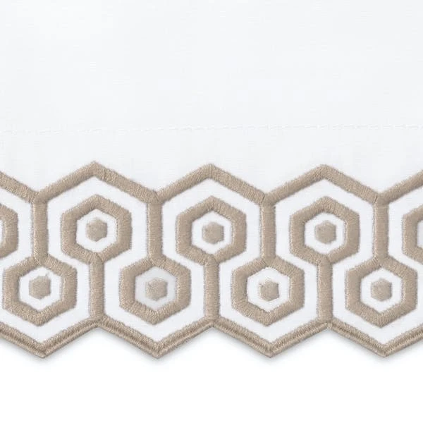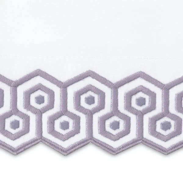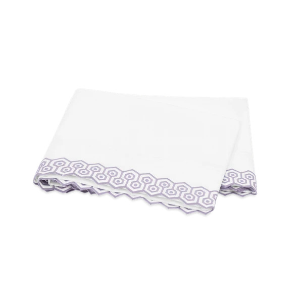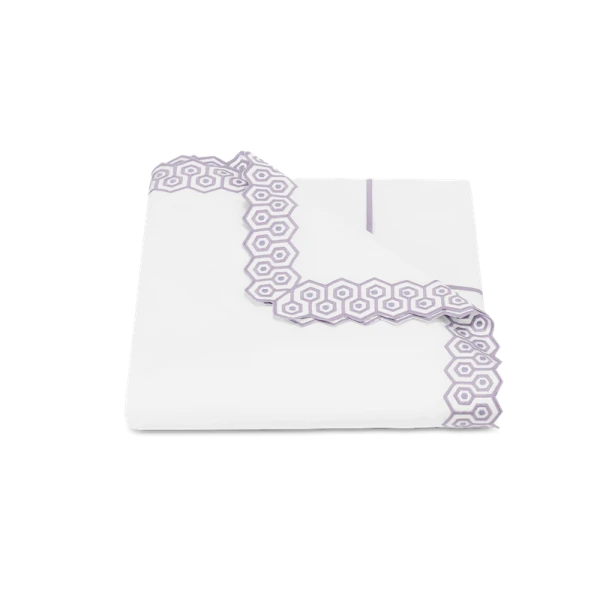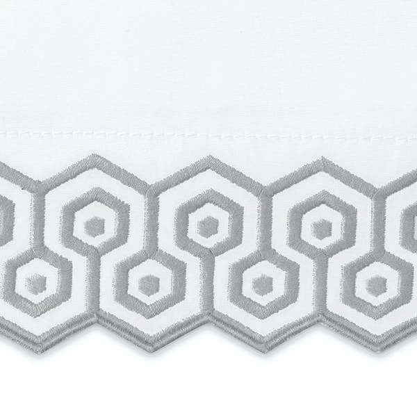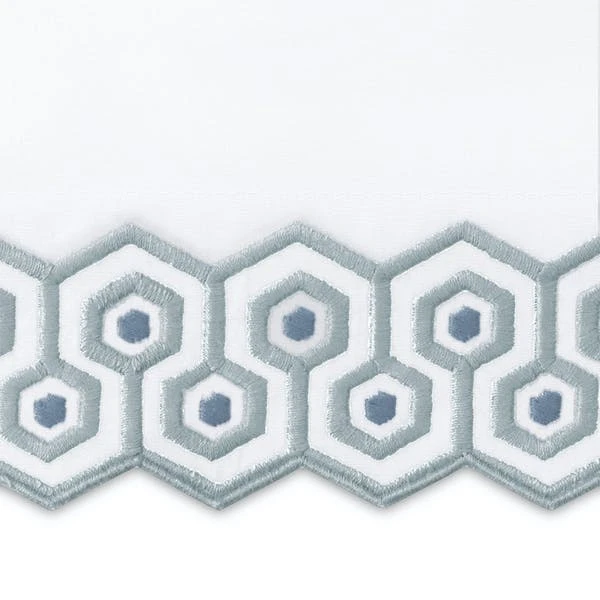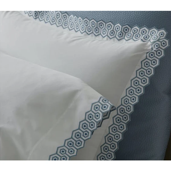 Matouk's Feliux brings together the craftsmanship comfort and beauty for which Matouk is known for. The artisanal embroidery of a two color interlocking honeycomb pattern enlivens their luxurious 600 thread count Milano Egyptian cotton, making Felix a visual and tactile delight. Available in five vibrant colors, an elegant satin stitch frames the top of the duvet cover.  Milano 600 thread count Egyptian cotton percale.  Made in the Philippines of fabric from Italy.