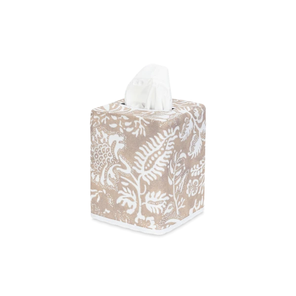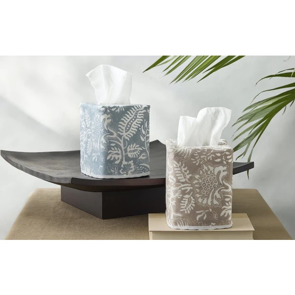 Matouk's Granada Tissue Box Cover's intricate pomegranate print brings an Old World bohemian charm to a crisp cotton percale. With subtle tonal variations inspired by the handcrafted nature of block print textiles, this style is ideal for artful layering in your bathroom. Luca 500 thread count Egyptian cotton percale. The perfect finishing touch for bedrooms and bathrooms. 100% Egyptian cotton outer shell with 100% linen lining. Made in the Philippines of fabric from Italy.