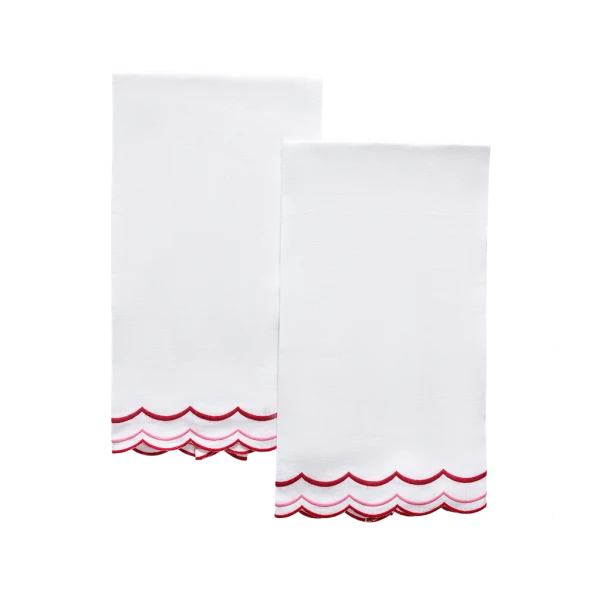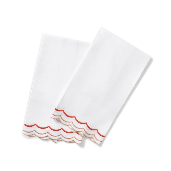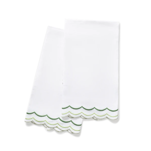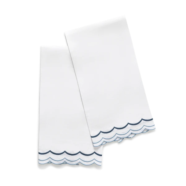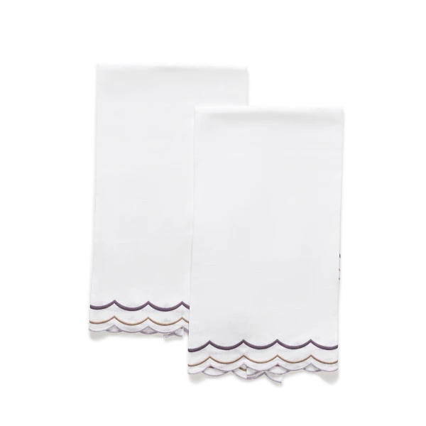 Matouk's India Three Guest towels are playful and sophisticated take on embroidery. Three distinct tones of parallel stitching adorn the narrow scalloped flange on Matouk's linen. Making this a sweet and elegant set of two guest towels. 100% linen. Made in the Philippines of fabric from Portugal.