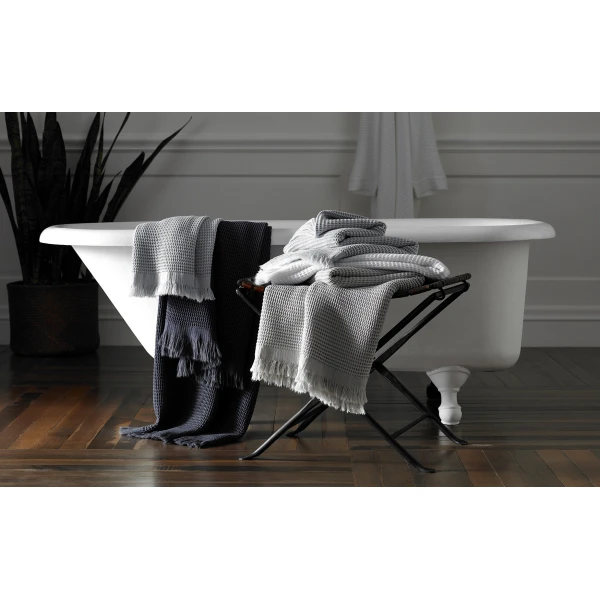 Matouk's Kiran is a unique waffle towel that will beguile you with its luxuriant suppleness and thirsty texture. Woven and finished in Turkey, it owes its softness to 25% bamboo blended with cotton. A delicate barred border with fringe is a special finishing touch.