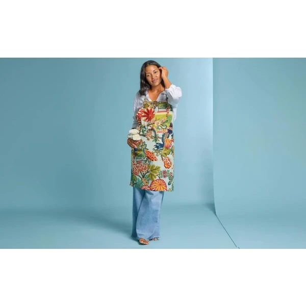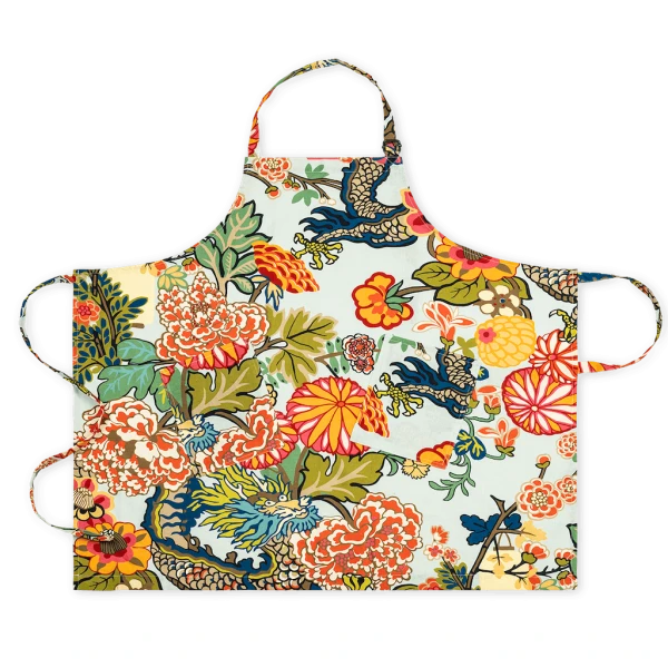 Matouk's Linen Apron Chiang Mai Dragon Aquamarine will add charm and style to your kitchen.  It features an adjustable strap and drawstrings for a perfect fit.  Their apron collection is made in Portugal and features four charming Schumacher prints.  One of Schumacher's all-time iconic designs, Chiang Mai Dragon is colorful, exotic and full of enchantment. 100% linen. Made in Portugal.
