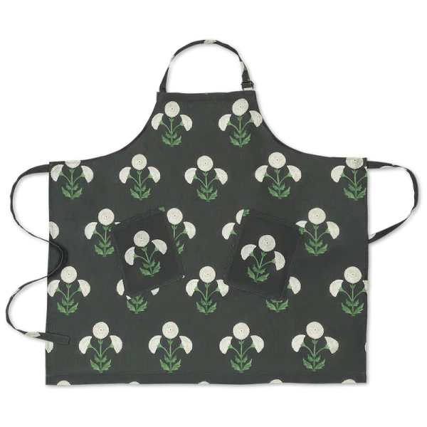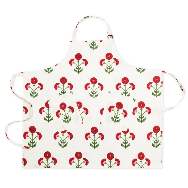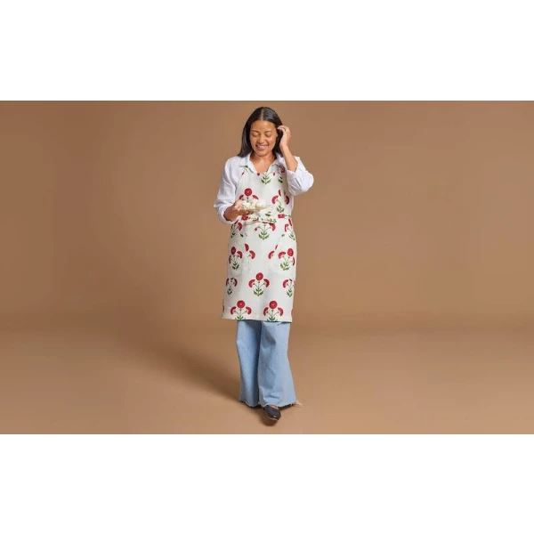 Matouk Linen Apron Giselle will add charm and style to your kitchen.  It features an adjustable strap and drawstrings for a perfect fit.  Their apron collection is made in Portugal and features four charming Schumacher prints. Artful, refined and whimsical all at once, this original Schumacher print comes to life with scarlet-hued blooming bouquets. 100% linen. Made in Portugal.