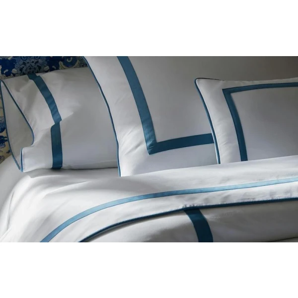 Matouk's Louise is Matouk's smooth Bergamo Giza Egyptian cotton percale with appliqués and knife-edge cording of colorful Nocturne, a 500 thread count Egyptian cotton sateen. A clean corded knife edge finish the duvet cover and shams. Louise Fitted Sheets are "Bergamo" sheeting. Made in the Philippines of fabric from Italy.