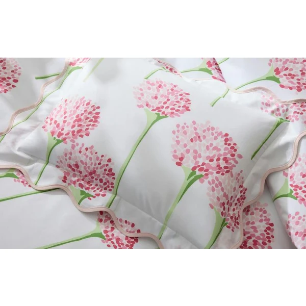 percale with a graceful vibrancy. Printed on 500 thread count long staple cotton percale in Italy and fabricated in the U.S. Shams, Flat sheet and duvet cover are scalloped and finished with a contrasting trim/piping.