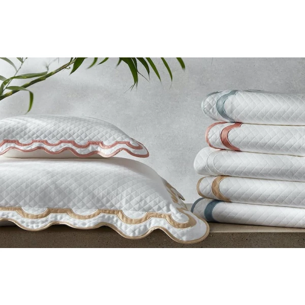 Matouk's Mirasol is a personal favorite. Mirasol embellishment infuses this classic diamond matelassé with a sunny, upbeat style. Originally inspired by Palm Beach shop awnings, the appliqué design expands the wider Mirasol sheeting range with a pliably soft coverlet quality crafted in pure cotton.
