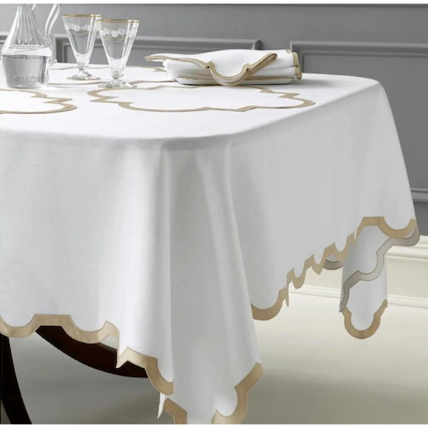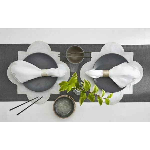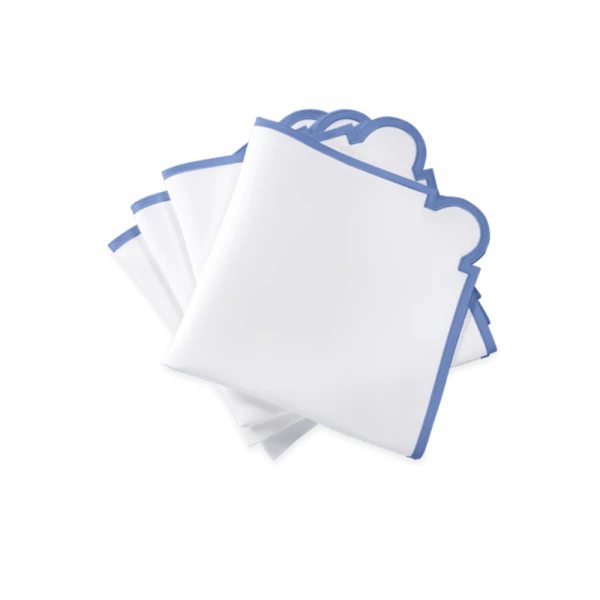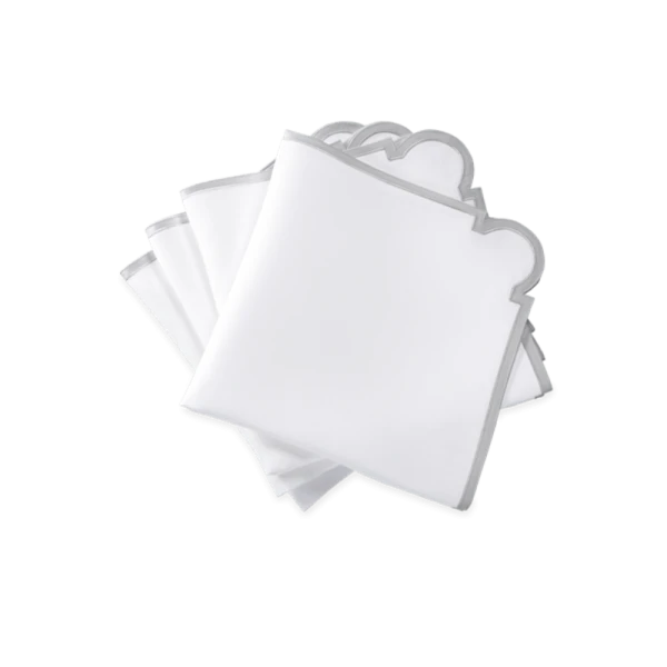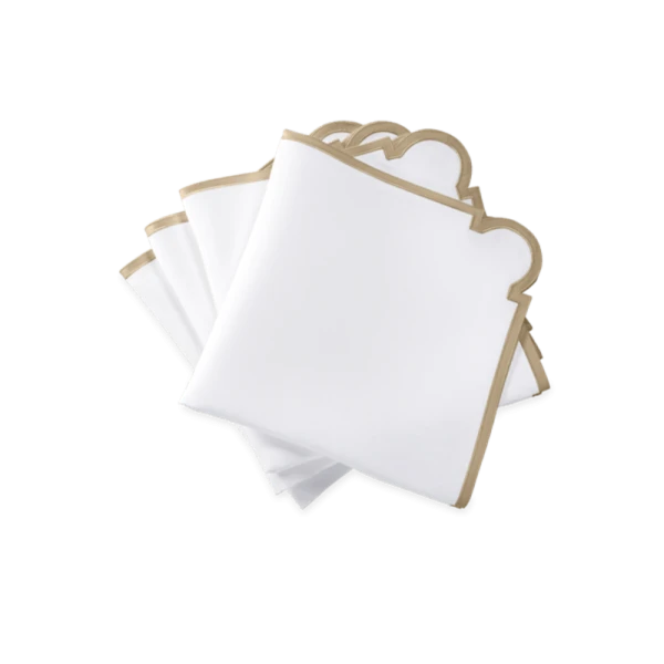 Matouk's Mirasol Neutral Table Linens were inspired by a stroll on Worth Avenue in Palm Beach, the unique arch trim of shop awnings becomes a tasteful complement to exquisite table linen. Available in several colors. We love mixing and matching the colors.