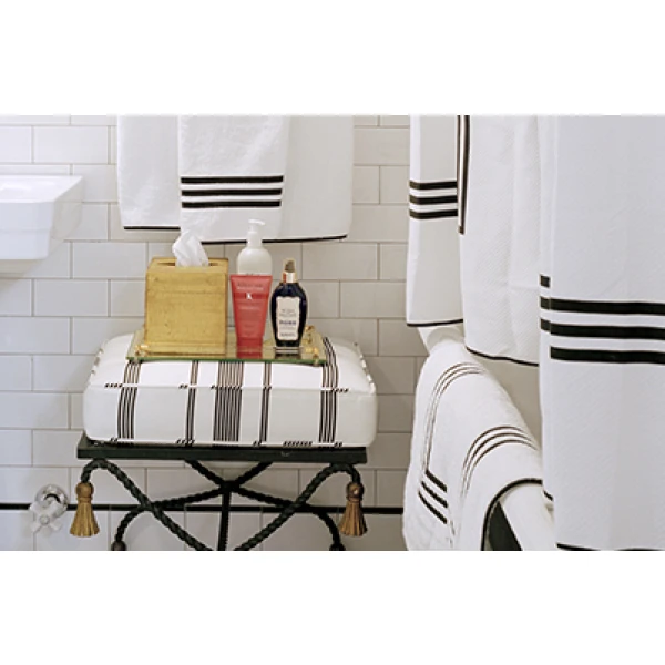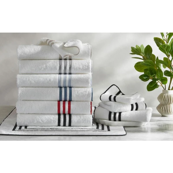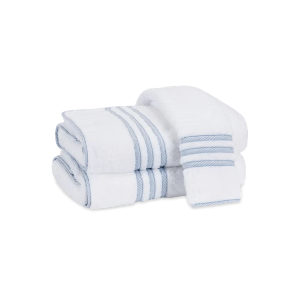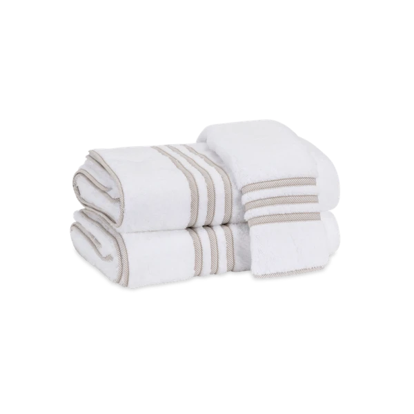 Newport, from Matouk, uses the Cairo towel and embellishes it with three lines of applique tape. Custom -- allow 4-6 weeks. Orders for this need to be placed via phone or email to select custom tape color.
