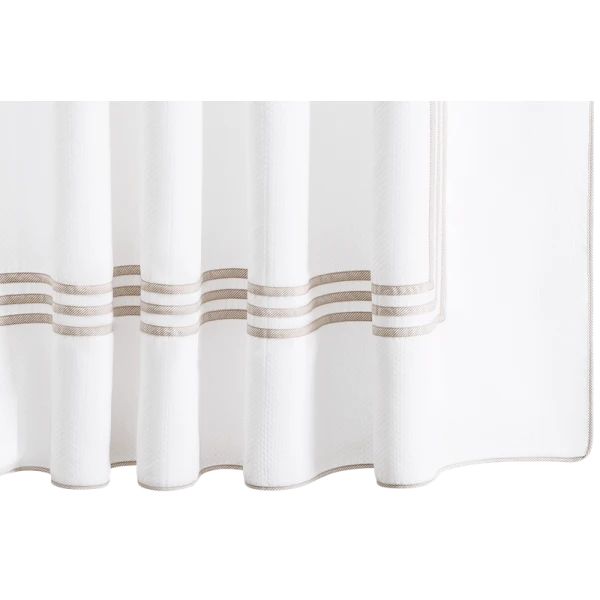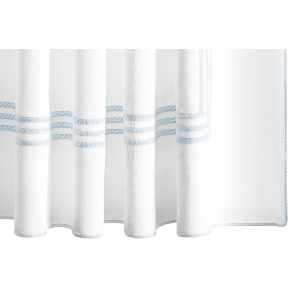 Matouk's Newport Shower Curtain is embellished with three lines of Nocturne sateen applique tape on diamond pique.  It is stunning!