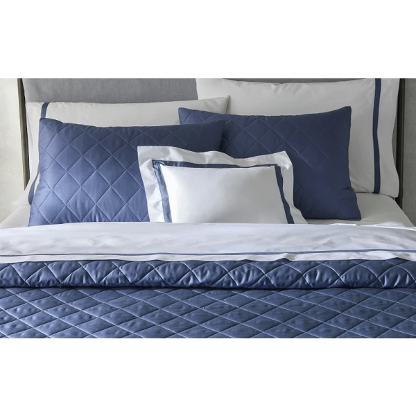 The Matouk Nocturne Quilt showcases an elegant harlequin quilted design with refined piped detailing and graceful drape. Constructed with 600 thread count Egyptian cotton sateen woven in Italy, this quilt combines luxury with durability. The backing features a smooth 300 thread count sateen, while the interior is filled with premium 100% polyester batting at 100 gm per square meter for optimal loft and comfort. Coordinating shams feature a clean knife edge finish. Expertly crafted in the USA, this quilt delivers sophisticated style and lasting quality for discerning bedding enthusiasts.