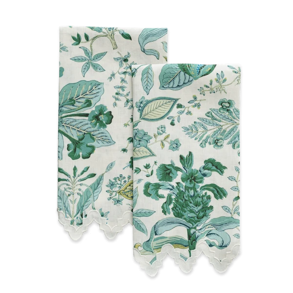 Matouk Pomegranate Linen Guest Towels in Emerald come alive with vivid florals and lush foliage. Matouk Schumacher Pomegranate print is reimagined in a guest towel on signature linen, finished with a geometric zig-zag silhouette in coordinating thread. With a rich botanical feel in vivid hues, it brings a sense of fantasy and whimsy to powder rooms and guest rooms alike. Made in the Philippines of fabric from Portugal. Set of two. 100% linen.