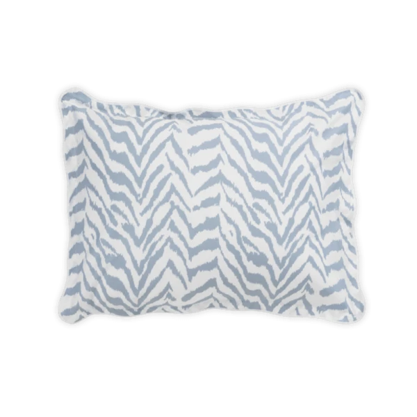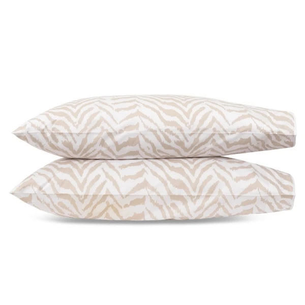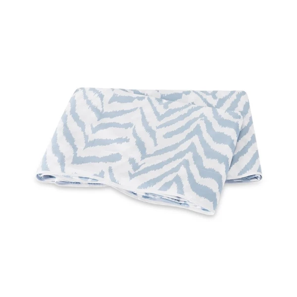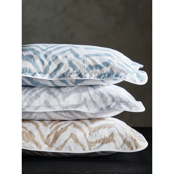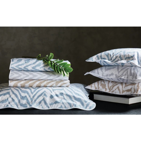 Matouk's Quincy was inspired by Schumacher's marriage of animal stripes and herringbone on crisp Luca percale 500 thread count Egyptian cotton percale woven and printed in Italy. For even more added detail it is all finished with a soft white tape scallop.  Duvet Covers have Luca White 500TC sheeting on the reverse. Made in the USA of fabric from Italy.