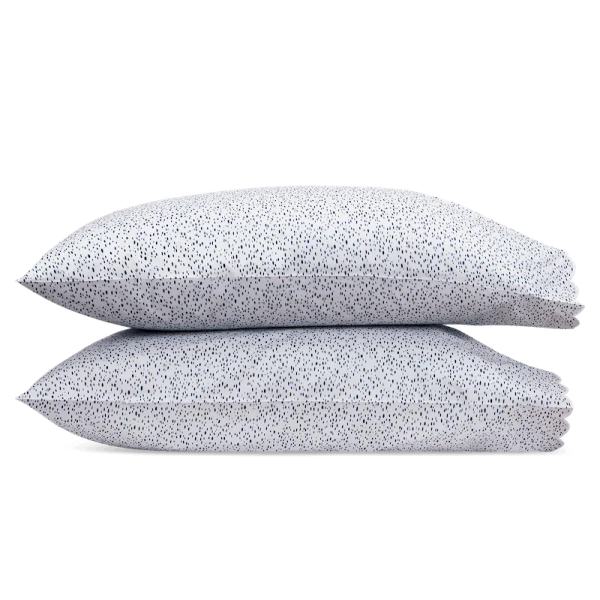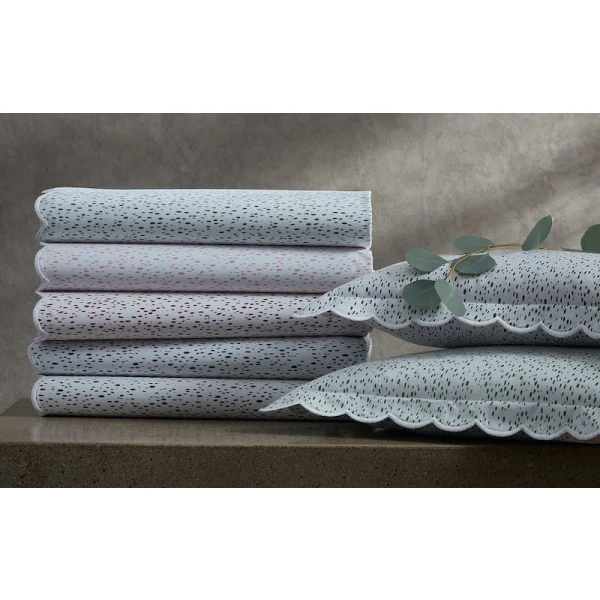 Matouk's Schumacher Celine is charming! A painterly dot pattern is printed on percale and each piece is finished with an embroidered scalloped edge. The color palette compliments the Schumacher Matouk bedding patterns but also stand on their own. Our favorite is the pink -- which is a traditional pastel shade that is under represented in the marketplace today.