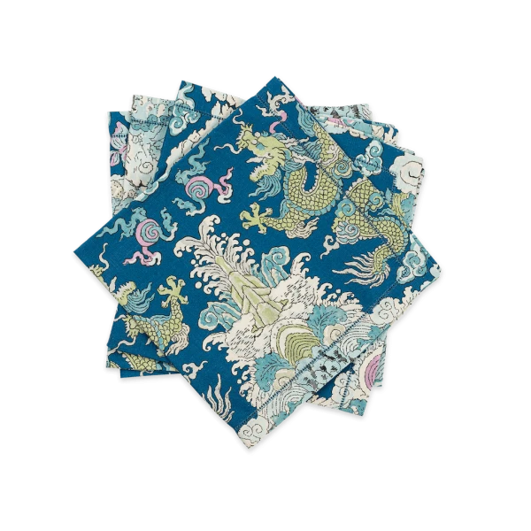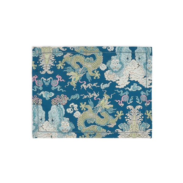 Matouk's Magic Mountain in Aquarius celebrates the fantastical motifs of ancient myth and legend, Schumacher's Magic Mountain features a psychedelic formation of foo dogs and fire-breathing dragons. Printed in Portugal on our signature table linen, this is a collection designed to make a statement—the perfect backdrop for both special occasions and everyday dining.  100% printed linen.  Made in the USA of fabric from Portugal.