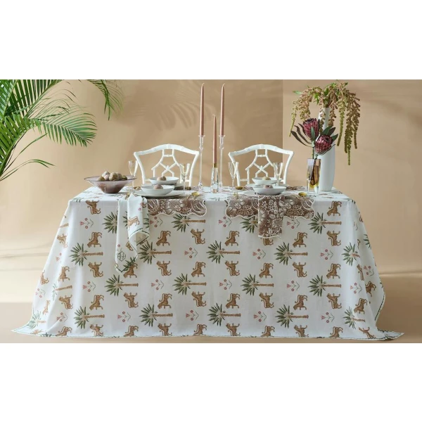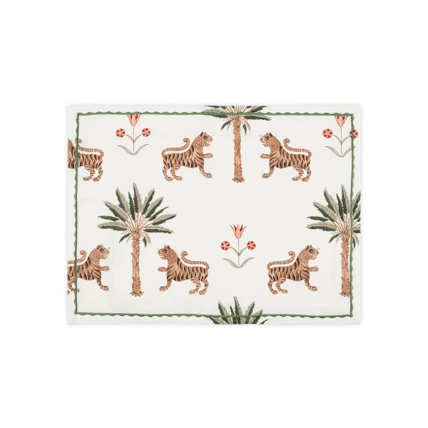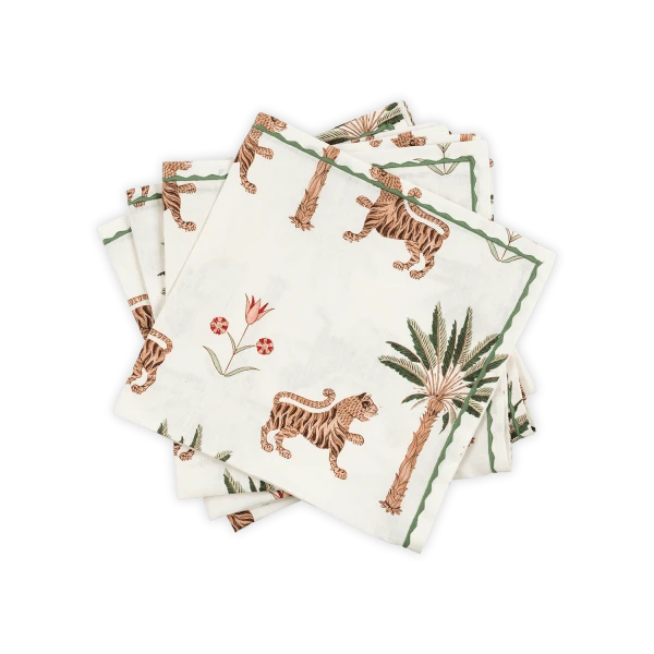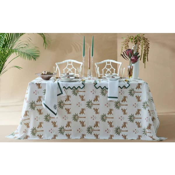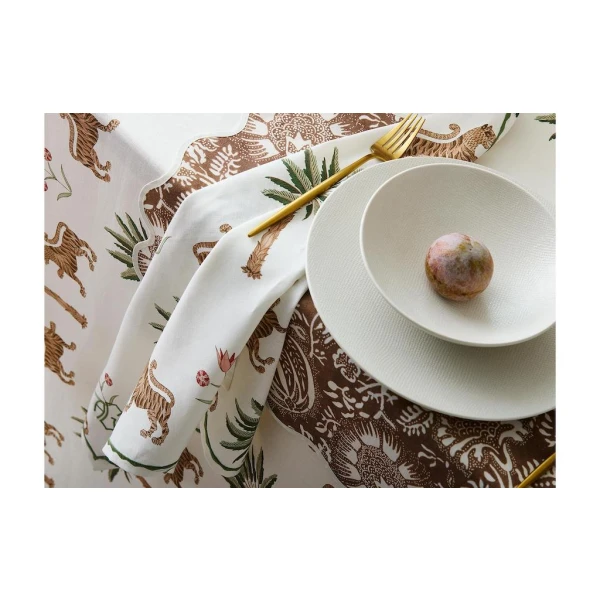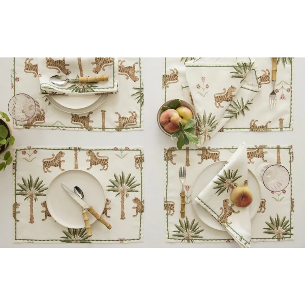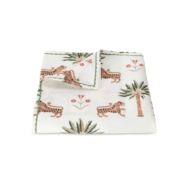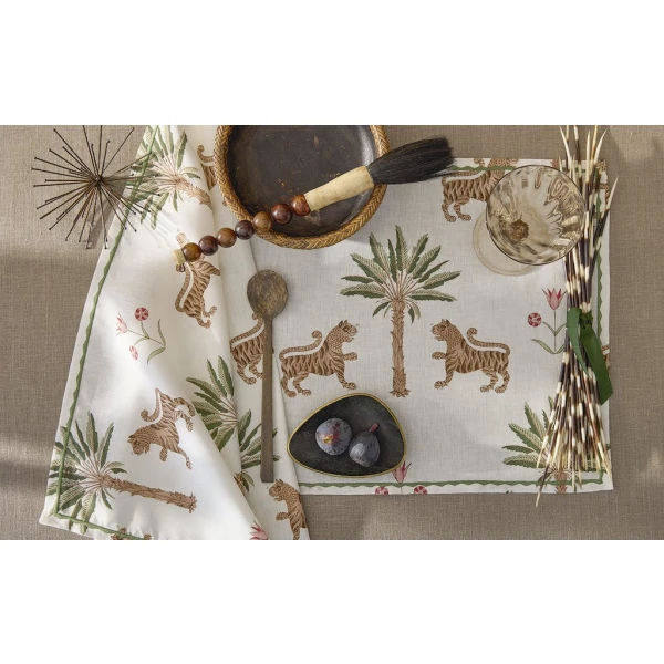 Matouk Tiger Palm Table Linens are enchanting. This original Schumacher design on soft linen was inspired by antique eastern block prints. Palms, tigers and sweet floral make a delightful backdrop for your gatherings. 100% linen. Made in the USA of fabric from Portugal. All of our fabrics are OEKO-TEX Standard 100 certified, meaning they are safe for you and for the planet.