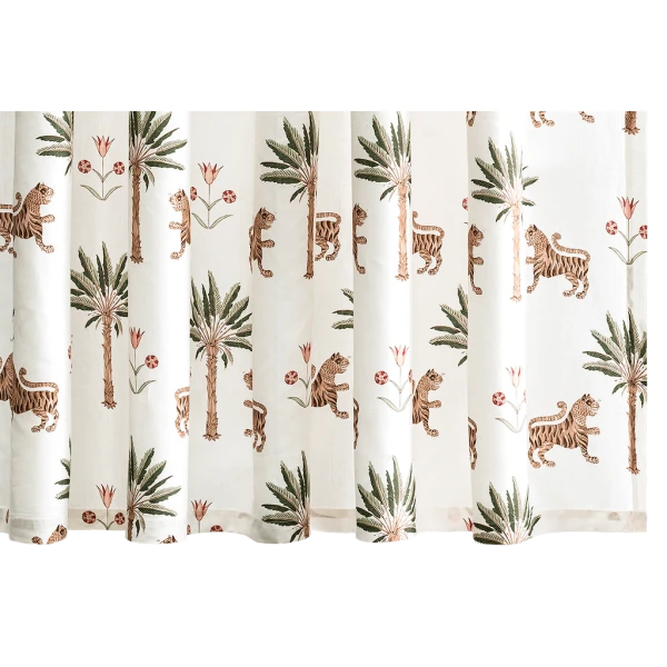 Matouk's Tiger Palm Shower Curtain is enchanting. This original Schumacher design on soft linen was inspired by antique eastern block prints. Palms, tigers and sweet floral make a delightful backdrop for your gatherings. 100% linen. Made in the USA of fabric from Portugal.