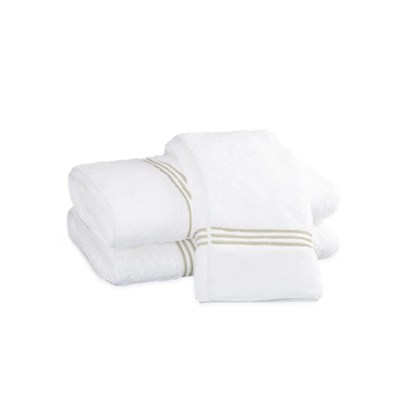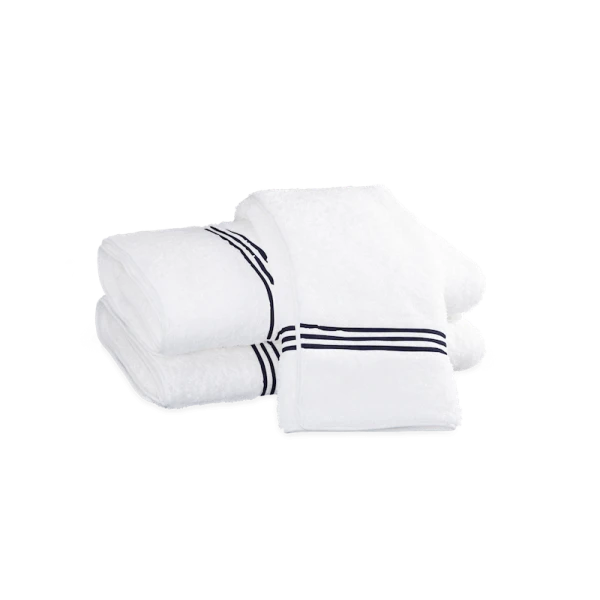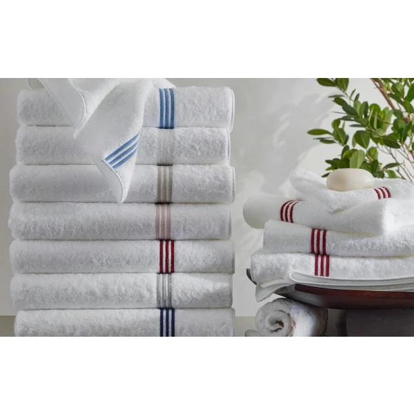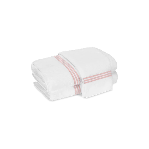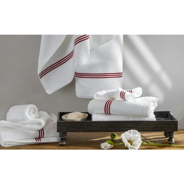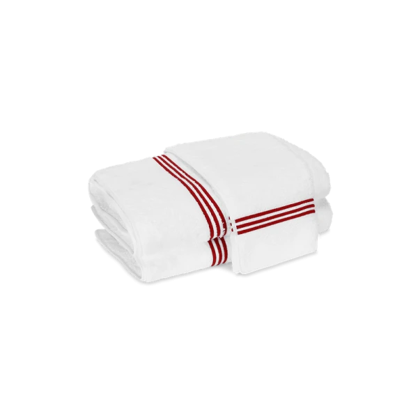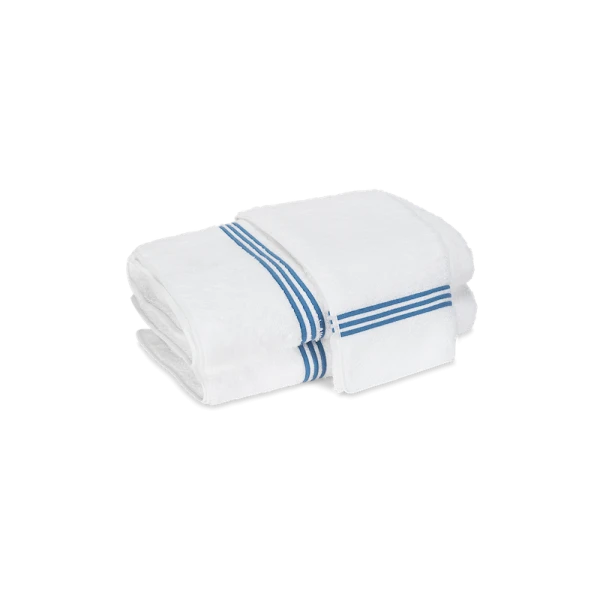Using the classic Cairo towel (625 gram weight, finished with white piping), the Bel Tempo towels have three lines of embroidered stitching in classic colors on both sides ot the towel. (Bath mat has on only one side). Features a convenient loop for hanging your towel. Made in the USA of imported Portugal fabric.