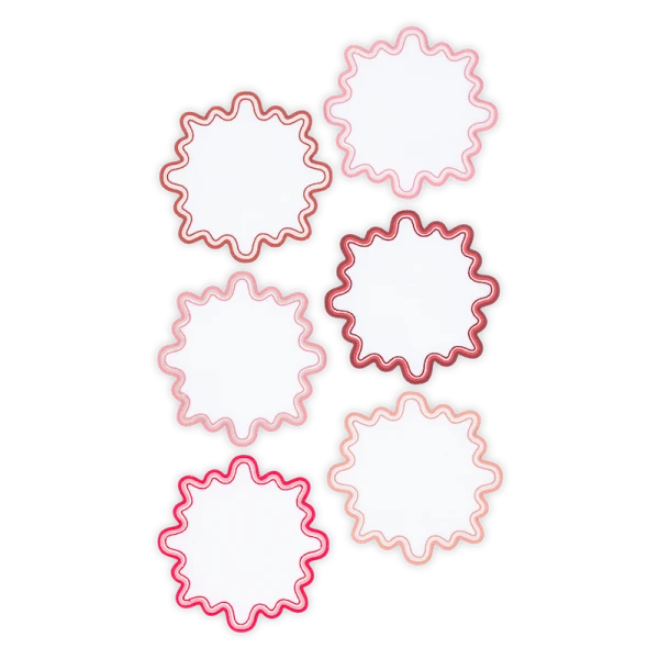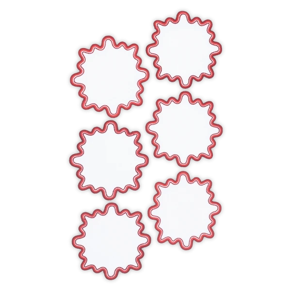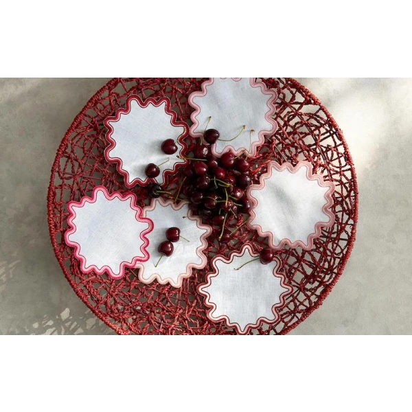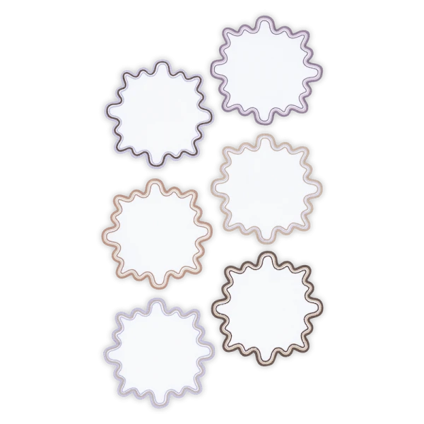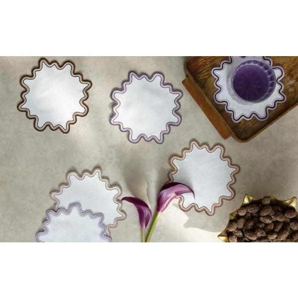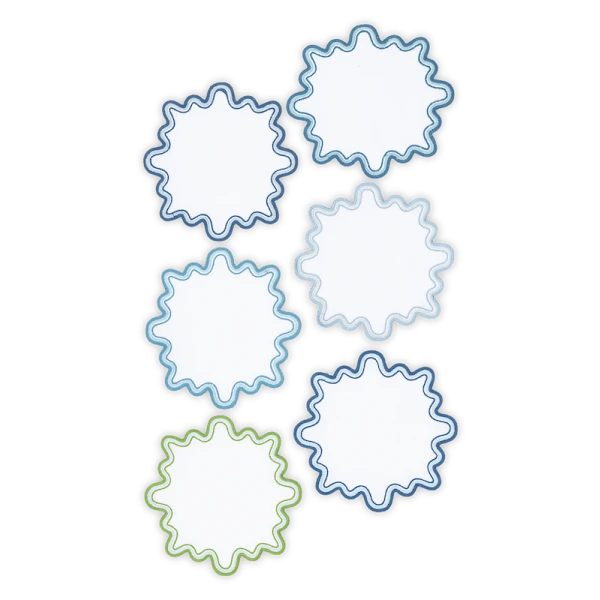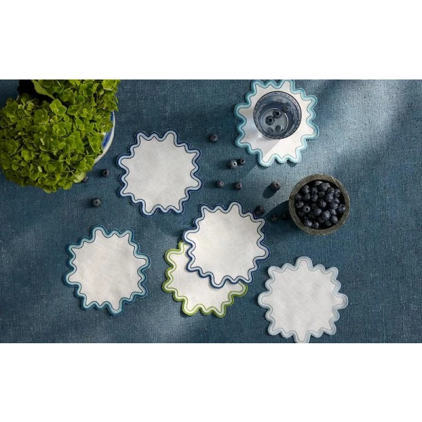 Matouk's Wave Cocktail Napkins Set has a playful shape that is emphasized by a meticulously embroidered border, with a unique two-color combination. 100% linen. Made in the Philippines of fabric from Italy.