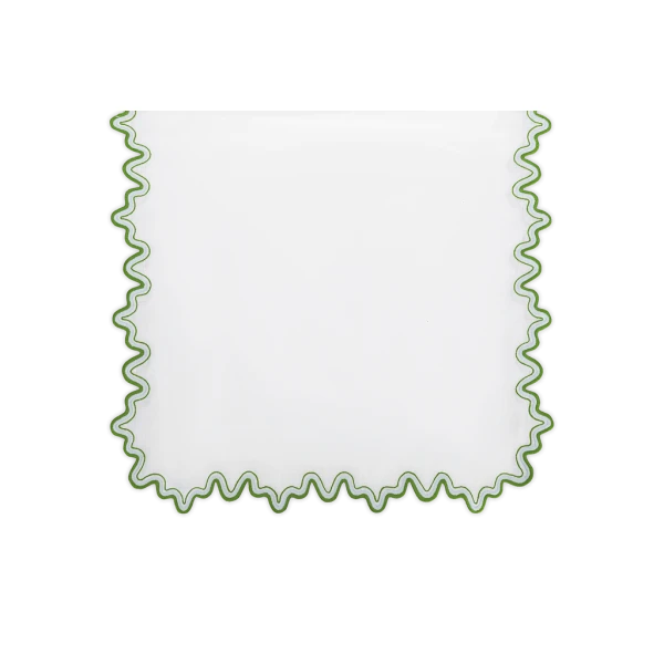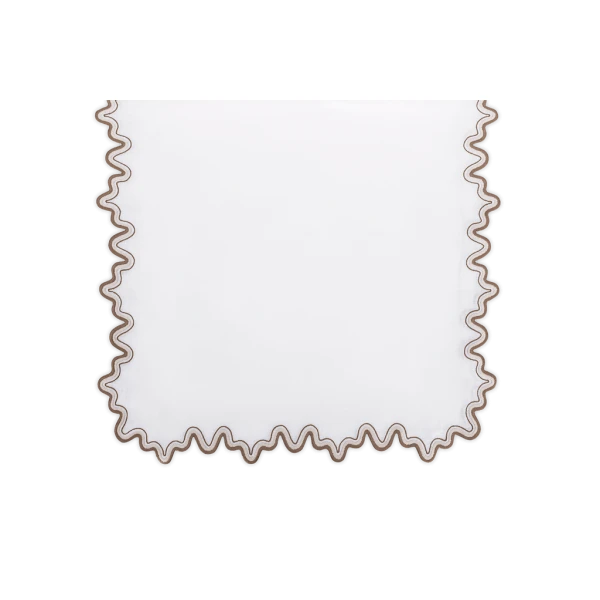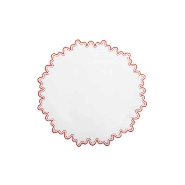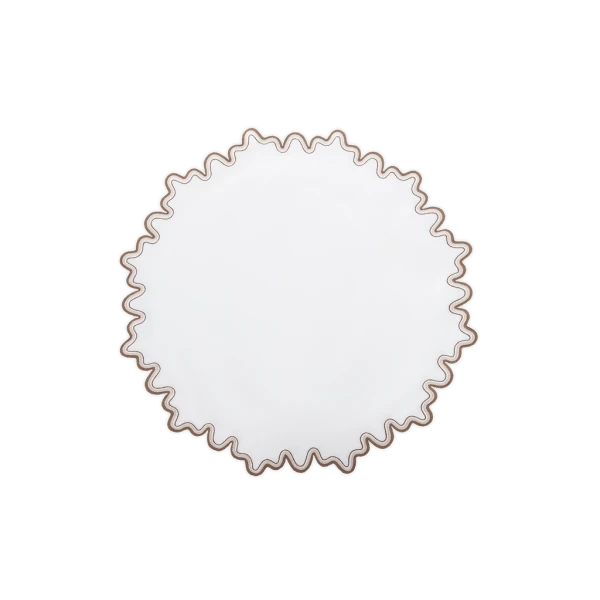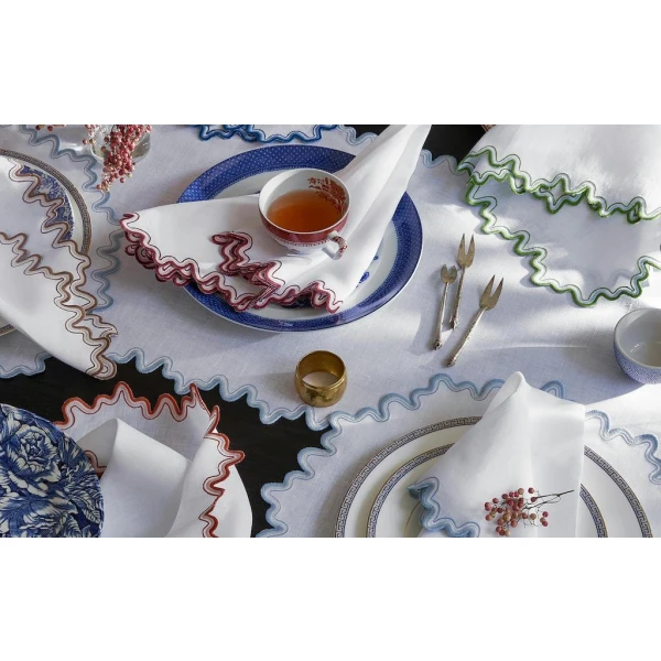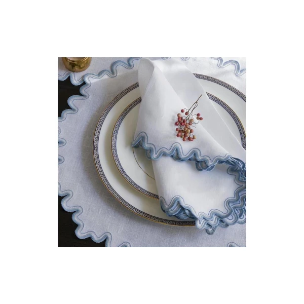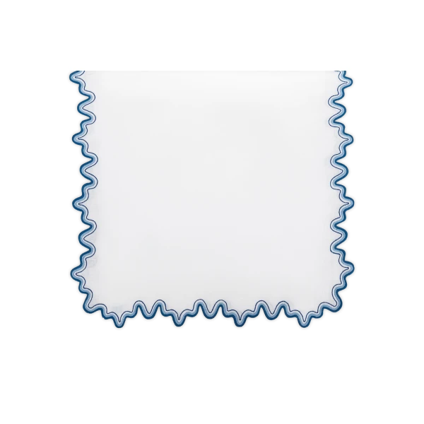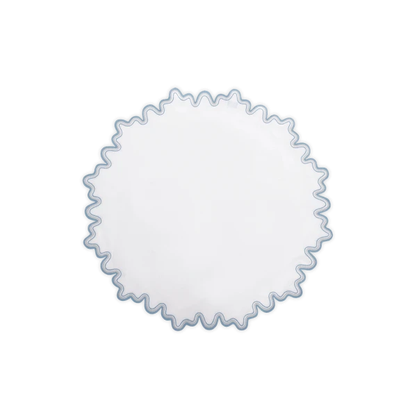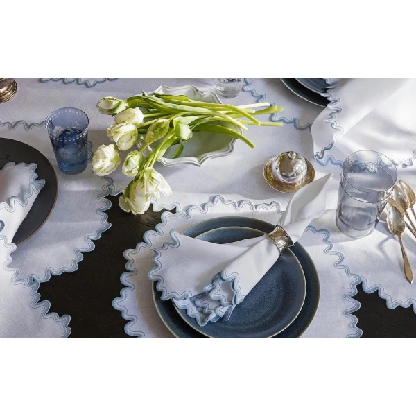 Matouk's Wave table collection has a playful shape that is emphasized by a meticulously embroidered border, with a unique two-color combination. 100% linen. Made in the Philippines of fabric from Italy.