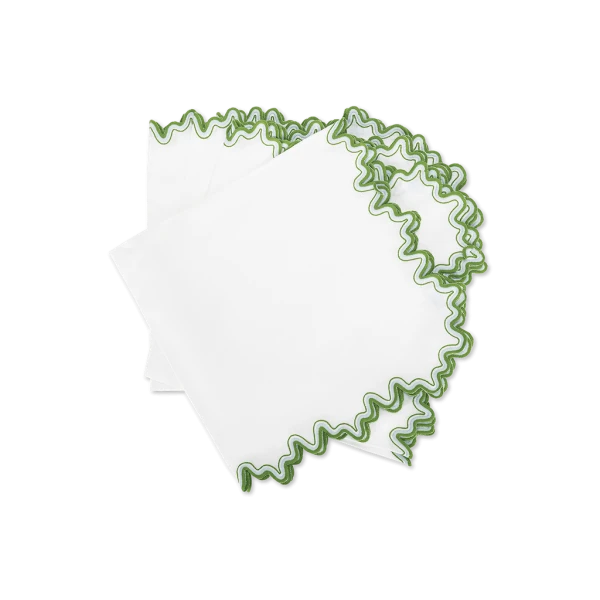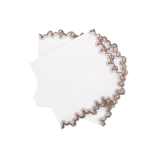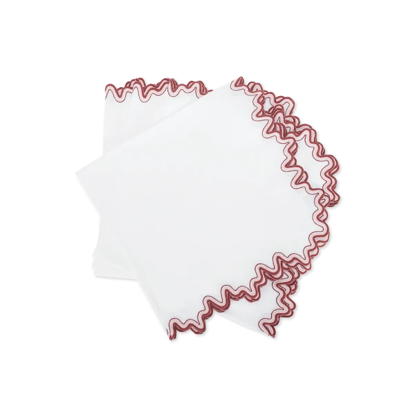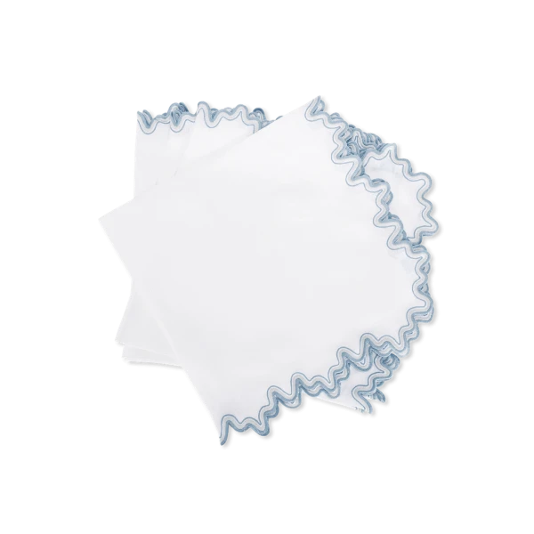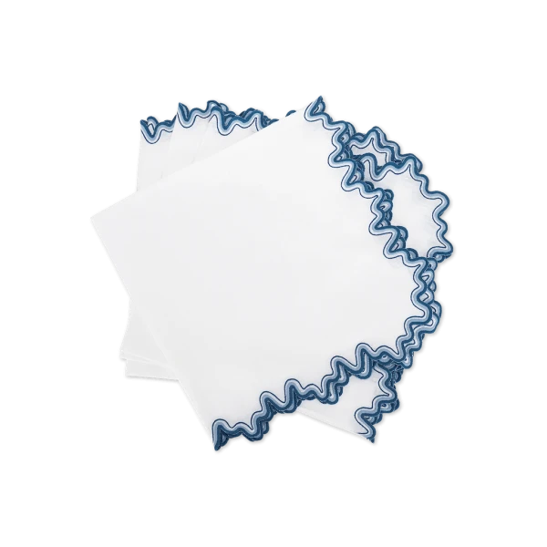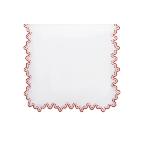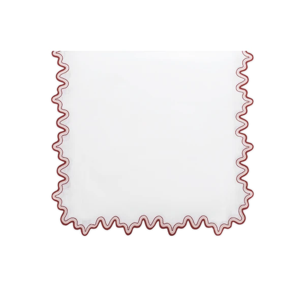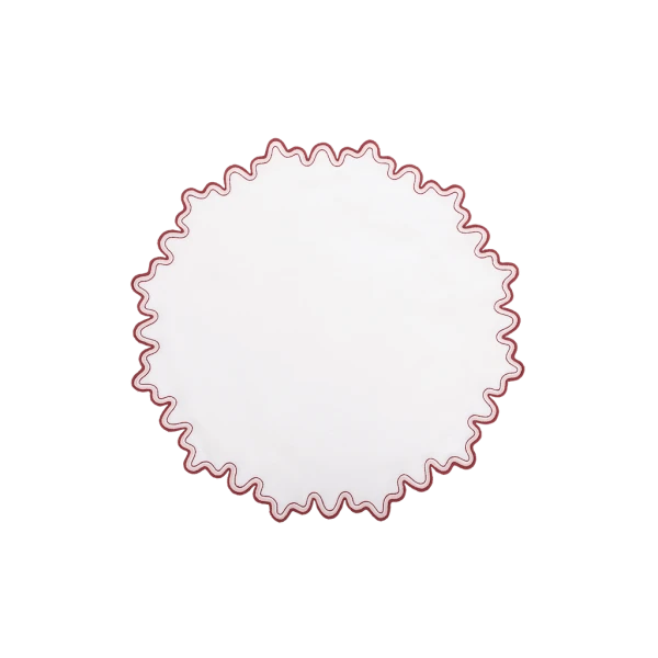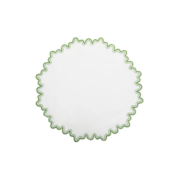 Matouk's Wave table collection has a playful shape that is emphasized by a meticulously embroidered border, with a unique two-color combination. 100% linen. Made in the Philippines of fabric from Italy.