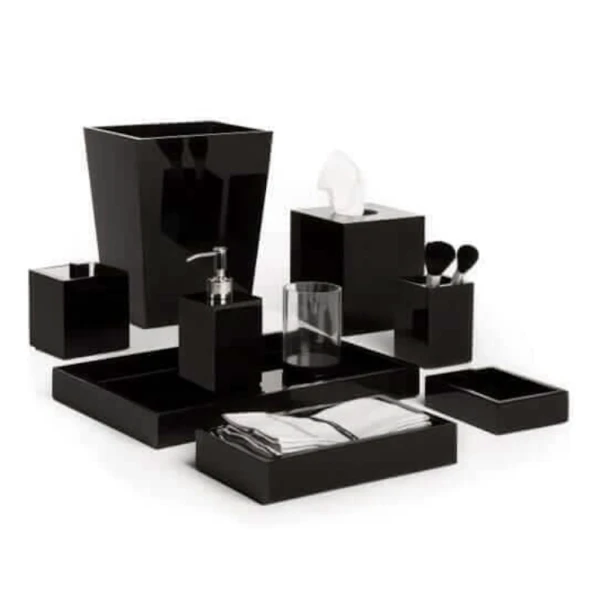 Mike + Ally's Ice Luxury Bath Accessories has been mastered by M+A. They only use high quality 3/8" thick clear Lucite.  It is then hand cut, assembled, polished and glued to a seamless finish. This collection coordinates with an array of bathroom décors.  Choose between gold or silver pump and gold or silver boutique box liner.