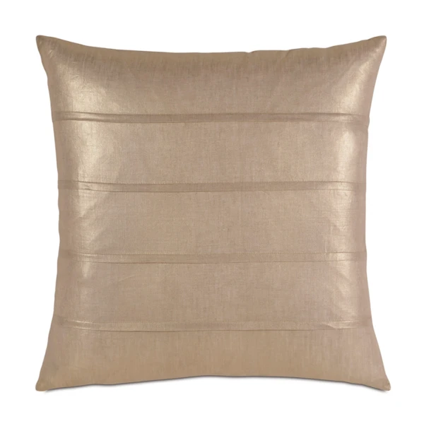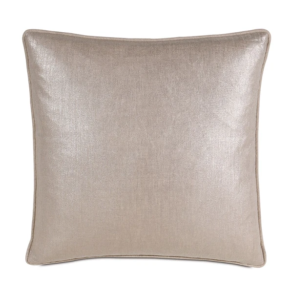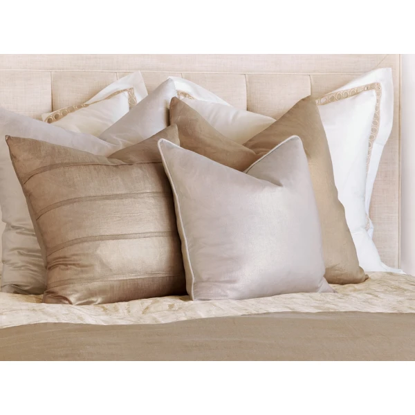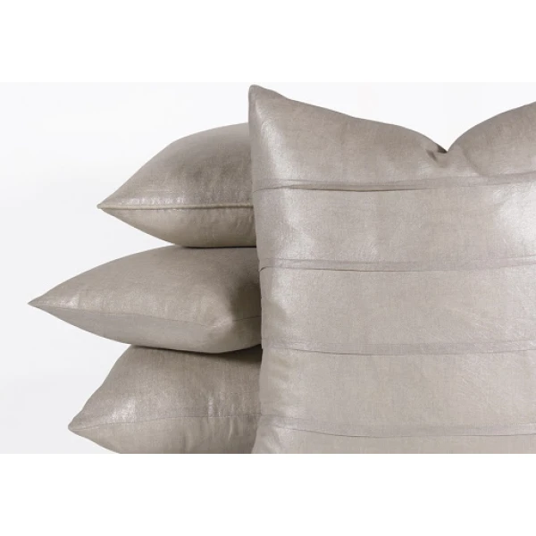 Shimmer, from Nancy Koltes, is now Aeriel. Available in three metallic linen colors,  Four different size pillows, including a euro, as well as a bed scarf/footquilt with slight padding. This simple pattern can make a bed. Note: that the 22" accent pillow has four pleats sewn across it. All ship with poly insert. Select 95/5 inserts for an additional cost. 100% linen silverprint woven in Belgium.