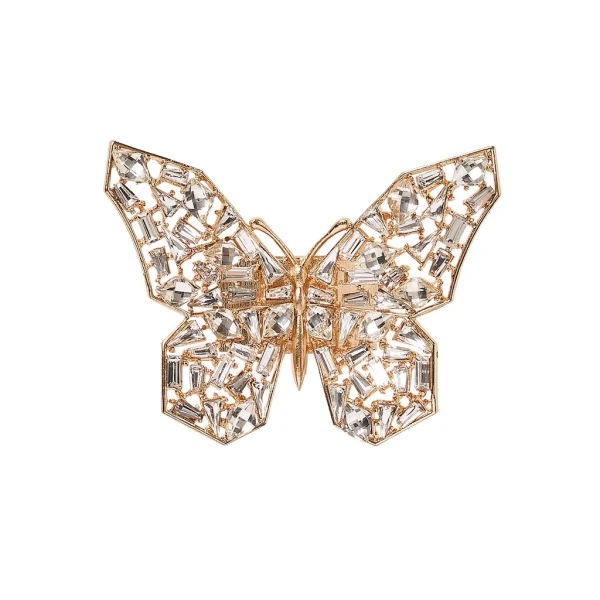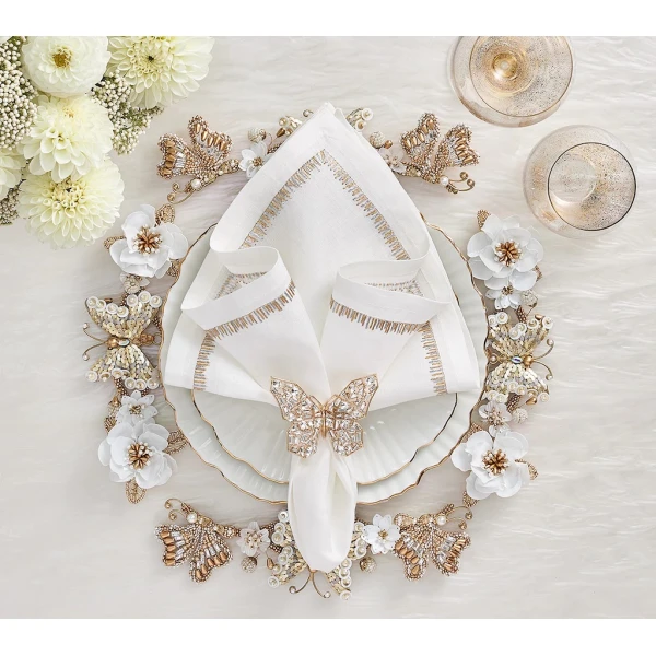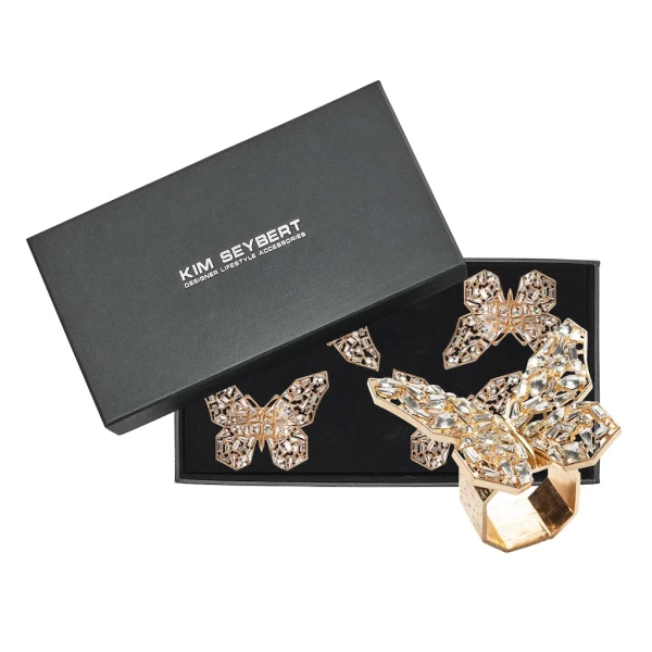 Kim Seybert's Papillon Napkin Ring in Gold & Crystal, Set of 4 in a Gift Box has gold- colored metal that is cast in an outline of a butterfly, which is decorated with an assortment of crystals in varying shapes and sizes. The glistening crystal rhinestones bring the butterfly's wings to life, lending the impression that the butterfly is about to take off. 3.25” Length x 2.5” Width x 2” Height. 75% Metal, 25% Glass