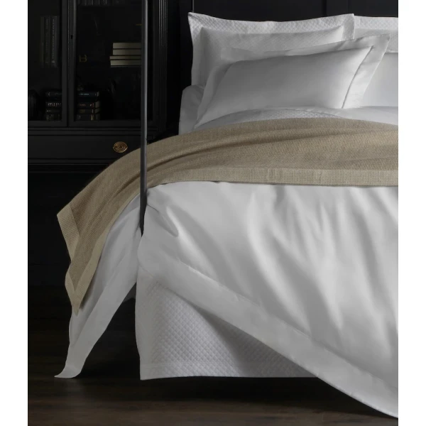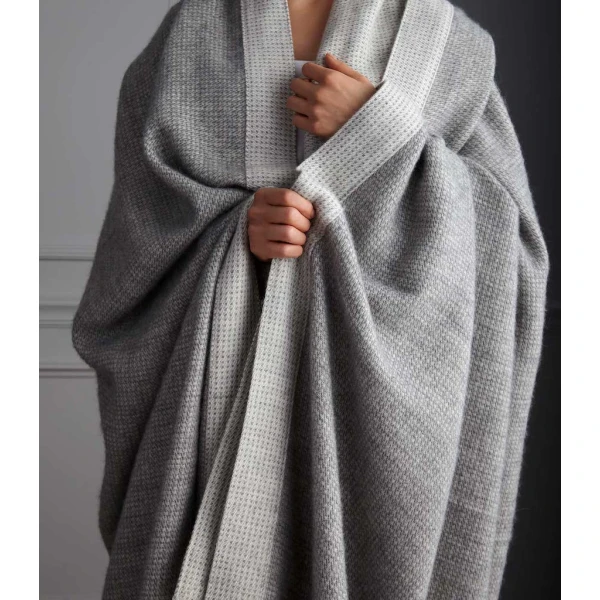 Peacock Alley's Angelo reversible blanket is the epitome of comfort and luxury. Angelo's blend of baby alpaca and fine cotton yarns delivers an enduringly soft but light feel. Two complementary tones of yarn are woven to form a versatile, reversible blanket that can be styled to fit any classic, traditional, or modern home. Reversible with a 2.5" mitered border on all four sides. 52% Alpaca / 48% Cotton. Imported from Lithuania, Designed in Italy.
