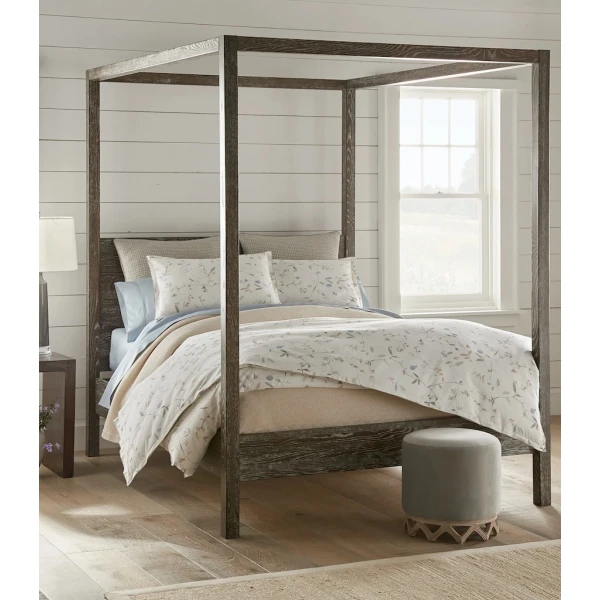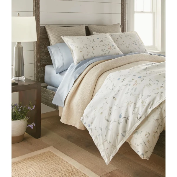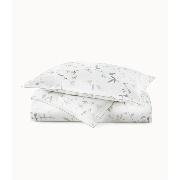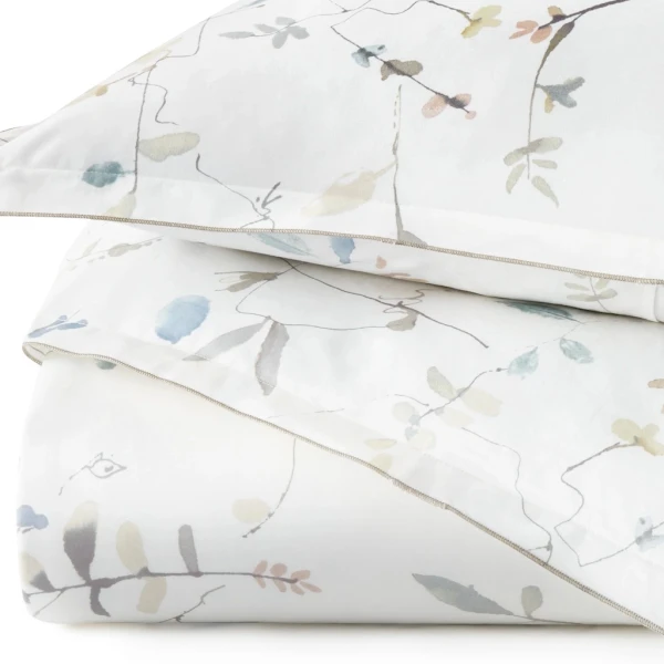 Peacock Alley's Avery is a true piece of art. It brings the serenity of nature into the bedroom with her artistic botanical design. Complete with an overlock stitch detail in Platinum to finish the look. Available in duvet covers and shams. Duvet covers have a 1" flange on three sides with a knife edge finish at the top and a button closure on the back. Reverse of duvet cover is the same fabric. Shams are constructed with a 1" flange on 4 sides and an envelope closure centered on the back. 100% Cotton. 200 Thread count percale sheeting. Made in Portugal.