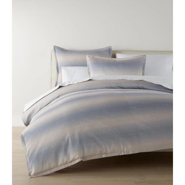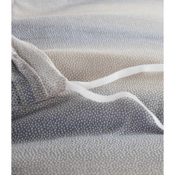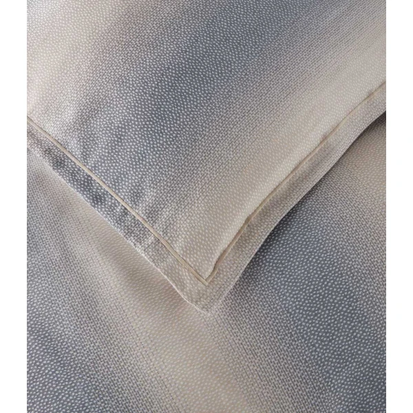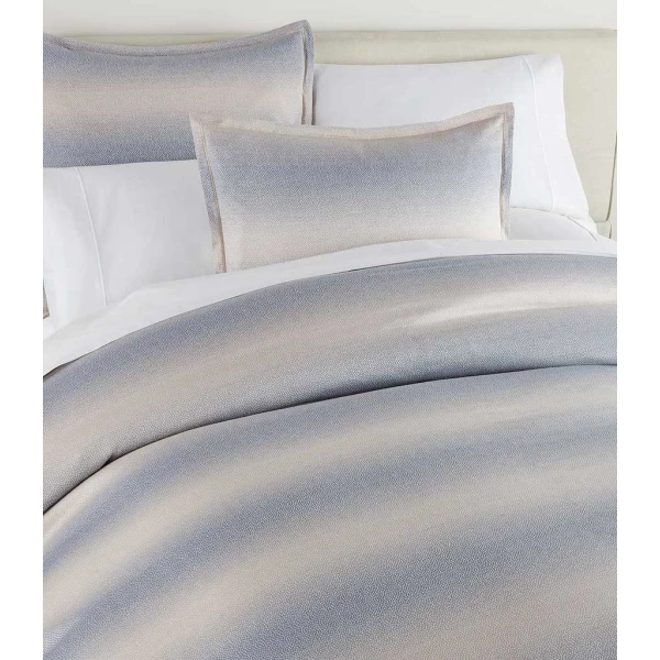 Peacock Alley's Elena will transform your bedroom into a serene oasis. Experience the soothing gradient of blue and neutral beige hues that seamlessly blend to create a tranquil and sophisticated ombré effect. Crafted with meticulous attention to detail, this collection combines style and comfort for a luxurious night's sleep. Elevate your bedding ensemble with the calming beauty of Elena and bring a touch of peaceful elegance to your sanctuary. Pattern runs horizontally across the bed. Duvet cover has a 1" flange on 3 sides with a light neutral beige satin stitch, a knife edge finish at the top and a hidden zipper closure on back 1" from hem. Duvet ties sewn into each corner. Shams are constructed with a 1" flange on all 4 sides and a light beige satin stitch hem, with an envelope closure on back. Yarn-dyed jacquard with ombré dot design in blue and light neutral beige. 100% Long staple cotton. Made in Portugal.