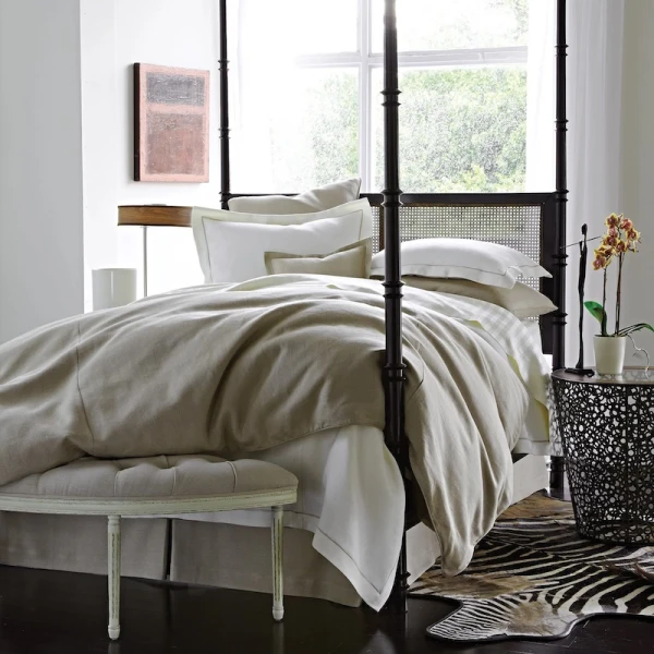 Rio Corded is like Rio Satin Stitch, but instead of the satin stitch finish with a small flange, it is self corded all around. Corded duvet covers are constructed with a cording detail on all four sides and an invisible zipper closure at the top. Flanged duvet covers have a 2" flange on 3 sides, and an invisible zipper closure at the top. Duvet ties sewn into each corner. Reverse of the duvet is a 200 thread count white cotton percale sheeting. Slubs and irregularities are part of the natural character of linen. Color and weave may vary slightly from dye lot to dye lot enhancing the beauty of the fabric. 100% Linen.