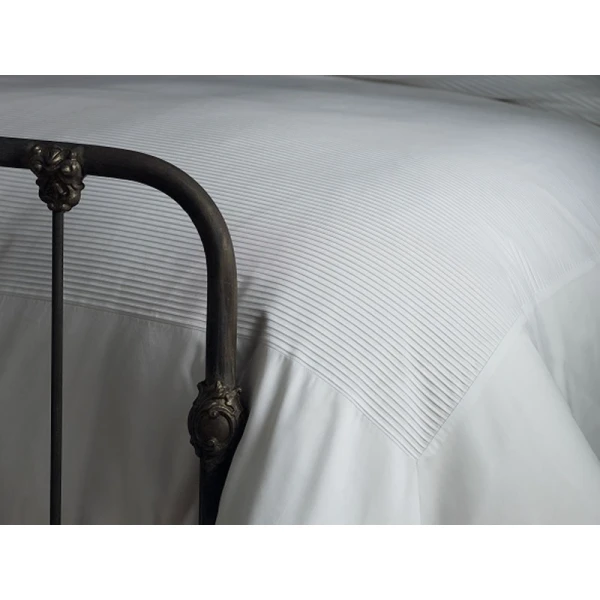 Sewn down tuxedo pleats adorn the center of this duvet cover and matching shams.  In white or ivory. 200 TC percale.