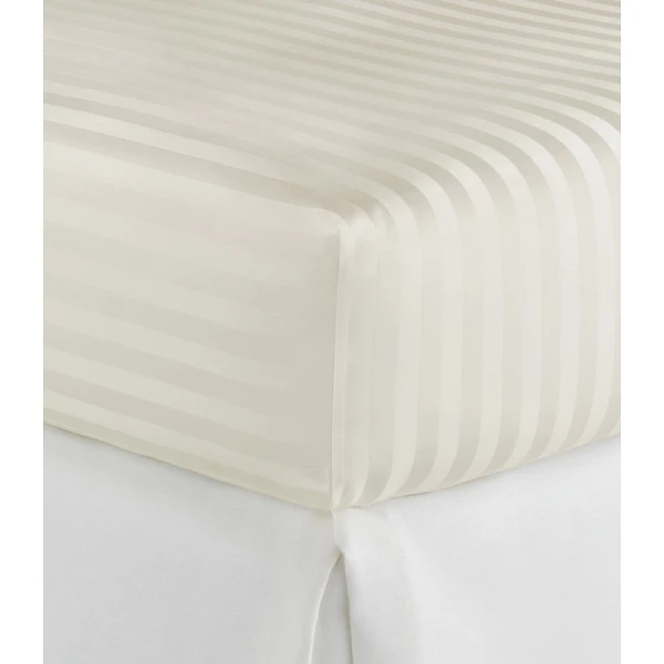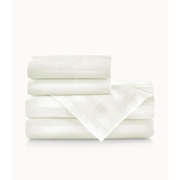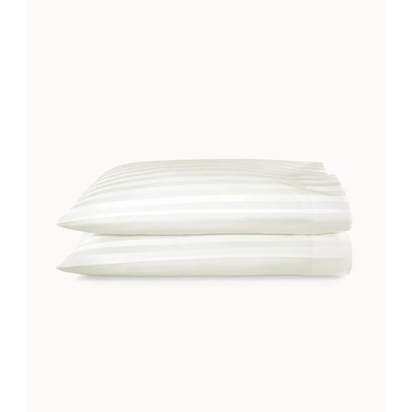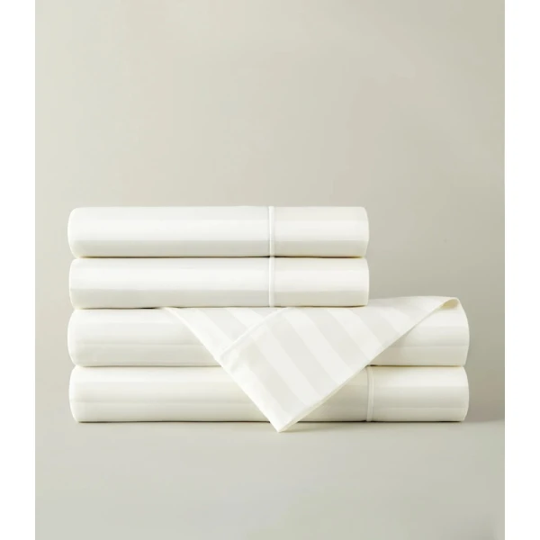 Peacock Alley's Soprano Stripe in Ivory came from their best-selling Soprano 100% cotton sateen bedding collection. Soprano Stripe is an instant favorite. The tone on tone 3/4" damask stripe design provides an essence of timeless sophistication. Slip into the soft, sumptuous comfort of Soprano Stripe and prepare to fall in love. Features tone on tone 3/4" damask stripes with a satin stitch on the hem of the flat sheet and pillowcases - 4" cuff. Available in Ivory and White. 100% Extra-long staple cotton. 400 Thread count sateen sheeting. Made in Portugal.