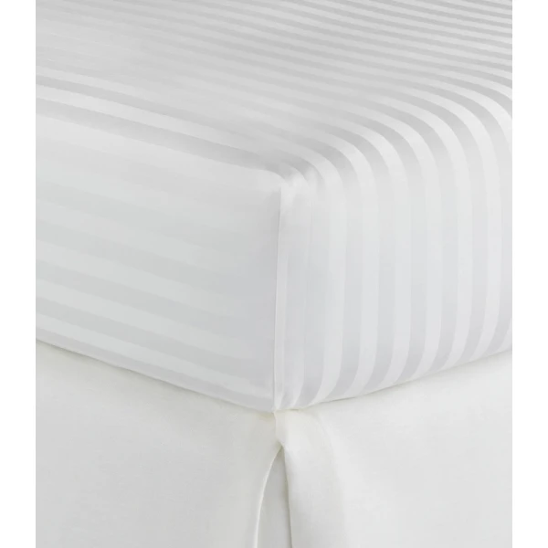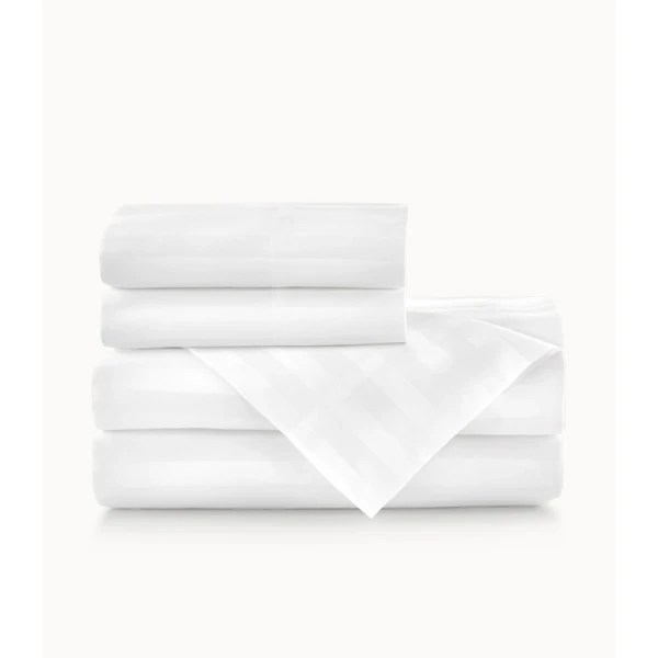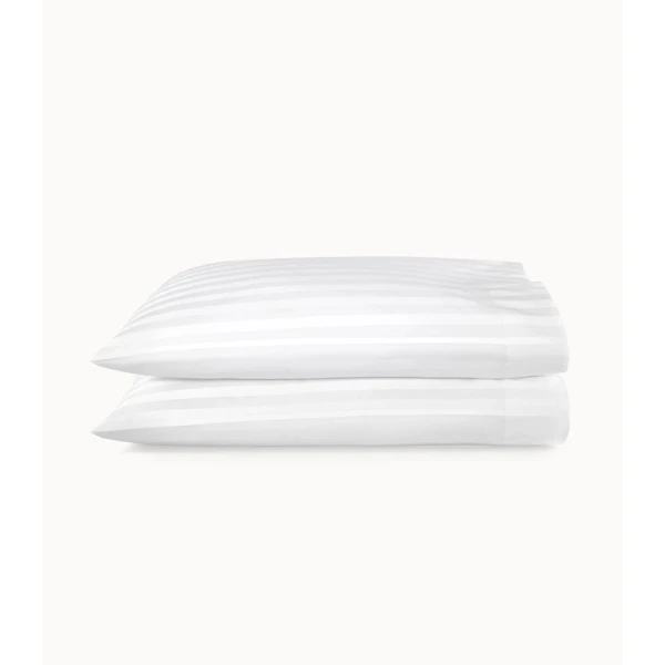Peacock Alley's Soprano Stripe in White came from their best-selling Soprano 100% cotton sateen bedding collection. Soprano Stripe is an instant favorite. The tone on tone 3/4" damask stripe design provides an essence of timeless sophistication. Slip into the soft, sumptuous comfort of Soprano Stripe and prepare to fall in love. Features tone on tone 3/4" damask stripes with a satin stitch on the hem of the flat sheet and pillowcases - 4" cuff. Available in Ivory and White. 100% Extra-long staple cotton. 400 Thread count sateen sheeting. Made in Portugal.